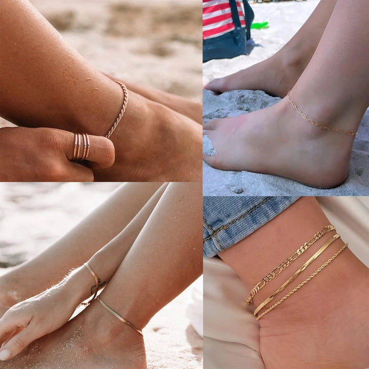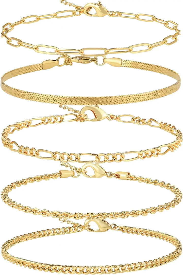 5Pcs 14K Gold Plated Anklet Bracelets for Women, Waterproof Plus Size Cuban Link Chain Ankle Bracelet for Large Ankle 9-12inch