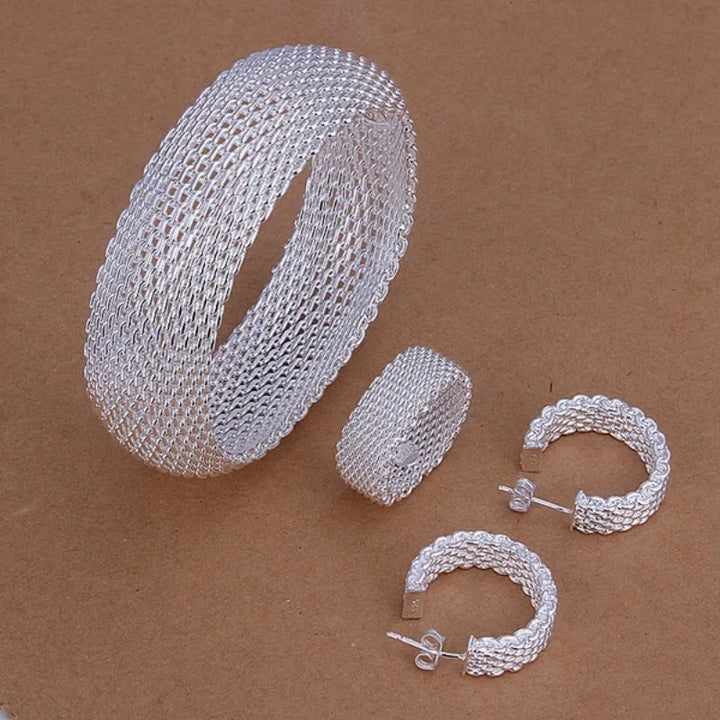 925 Sterling Silver Wedding Christmas Gift Retro Woven Mesh Bangle Ring Stud Earrings Fashion Fine Jewelry Set