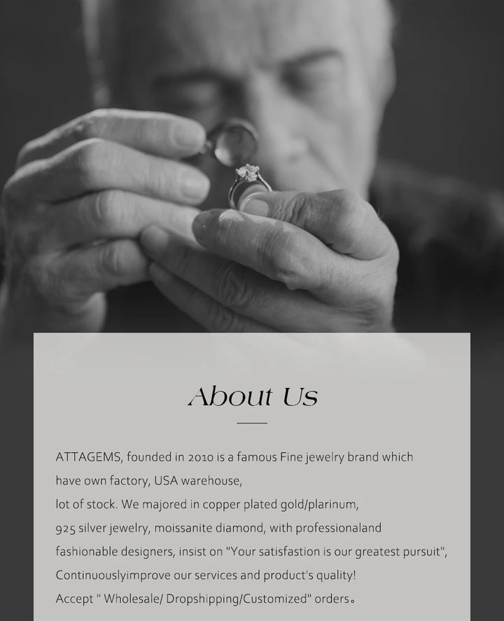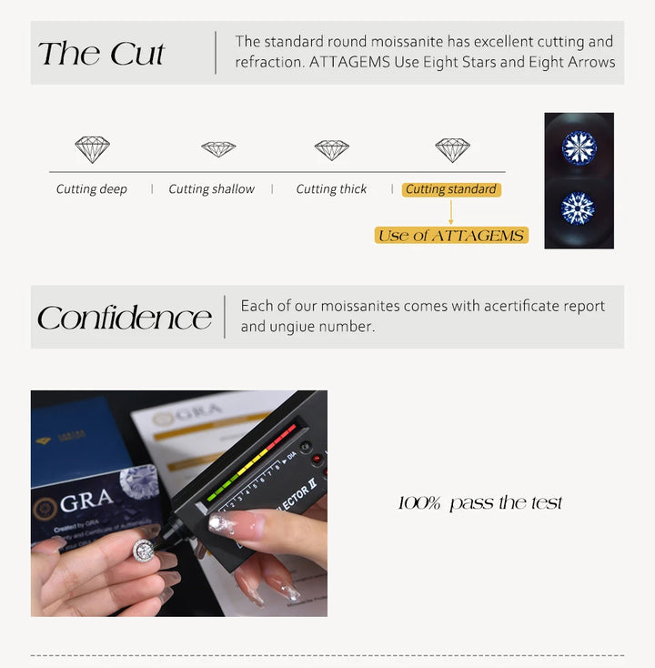 1. Moissanite used by ATTAGEMS is a laboratory-grown gemstone that has been carefully selected to ensure that all moissanite is D color VVS1 clarity, and is highly similar in appearance and performance to South African diamonds.