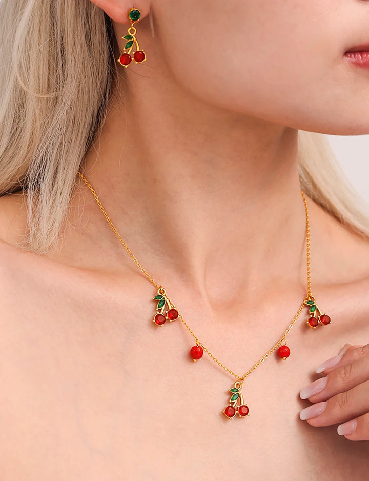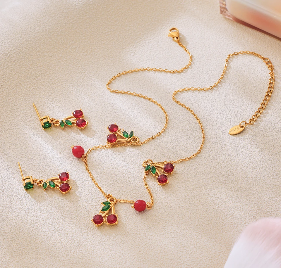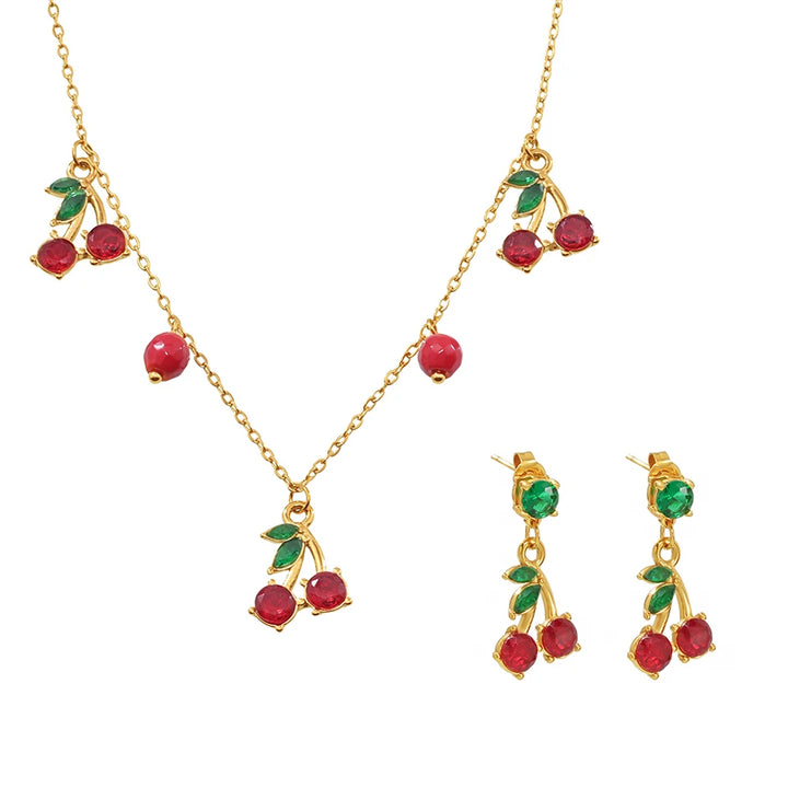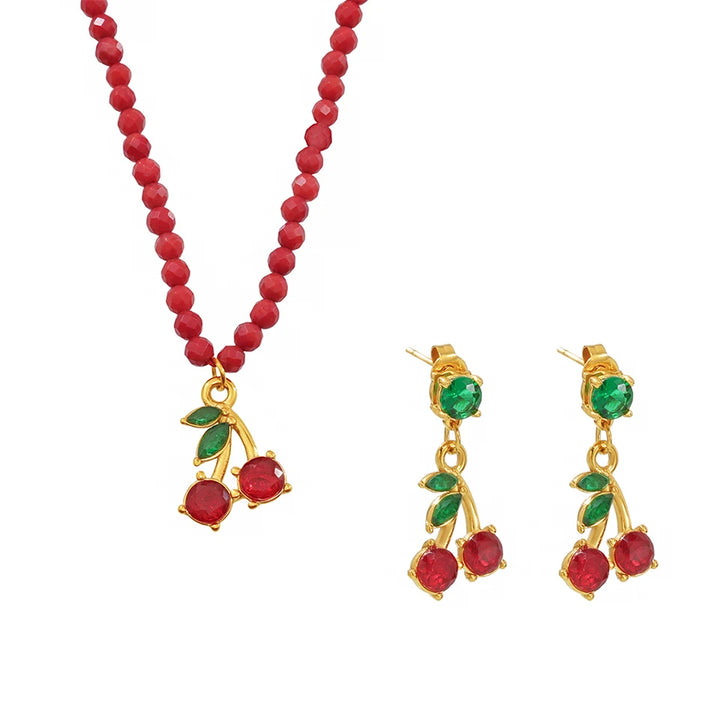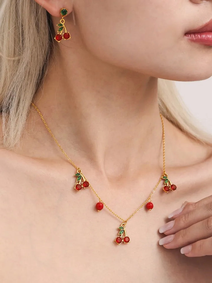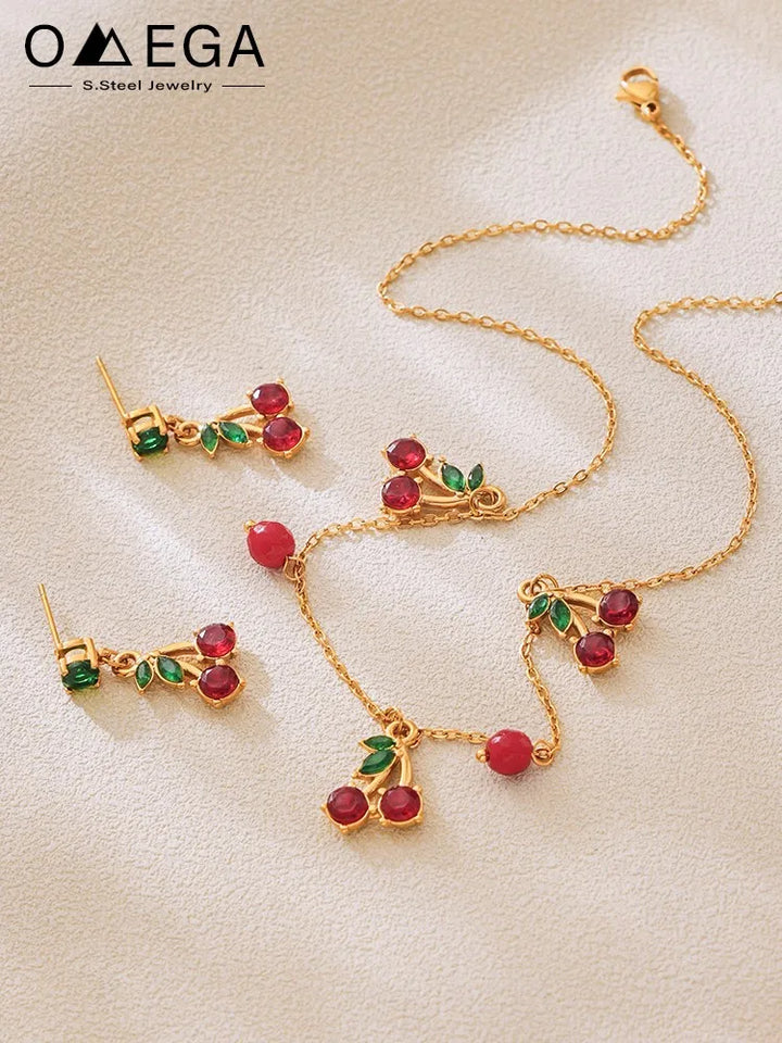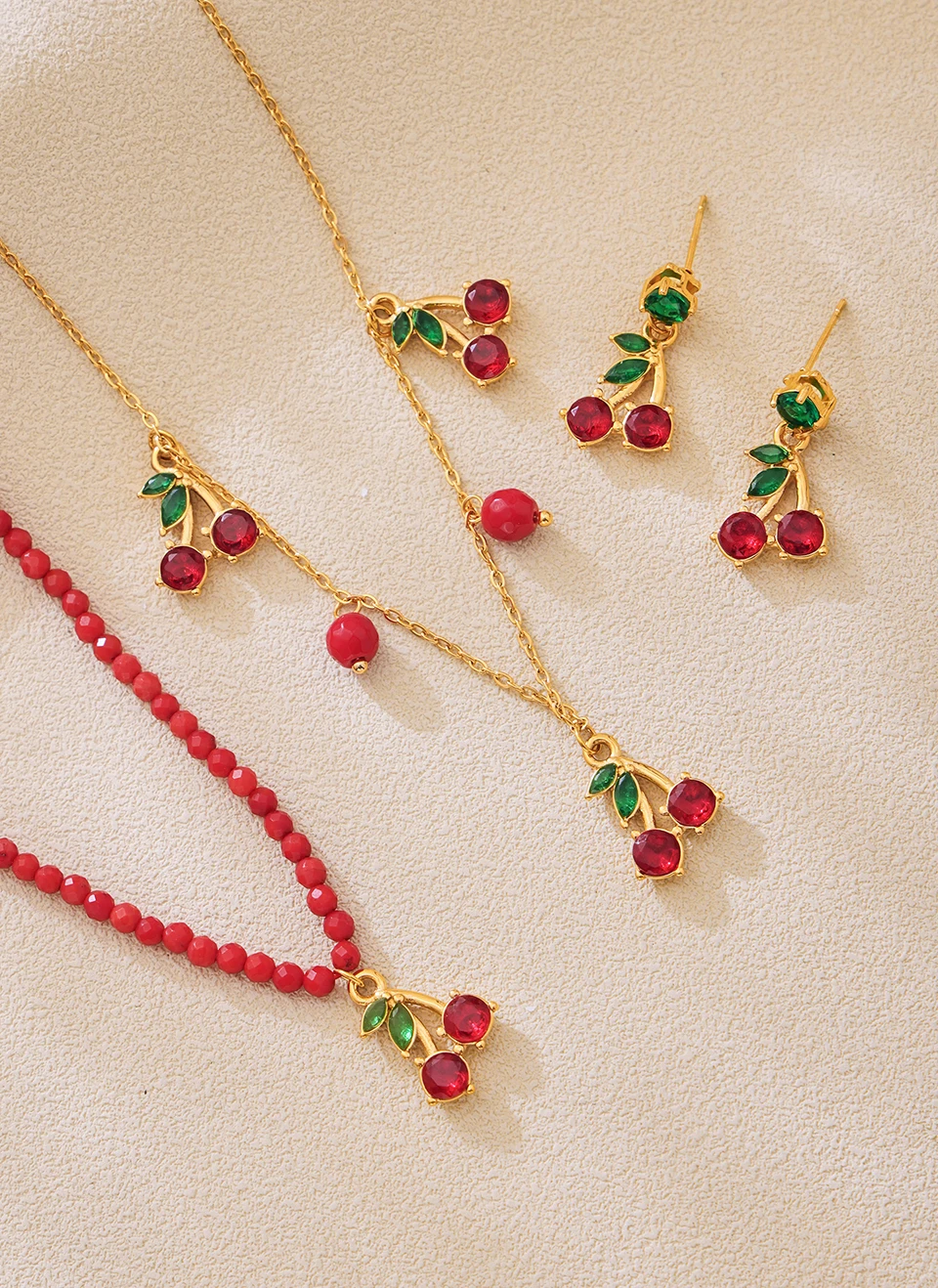 Cherry Charms Necklaces Matching Earrings For Women 18k Gold Plated Stainless Steel Women's Pendant Chain Necklace Stud Earring