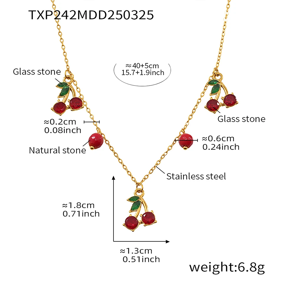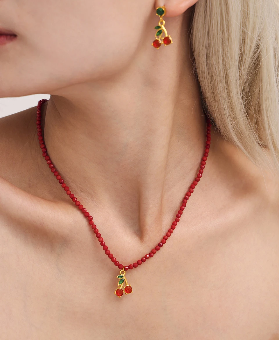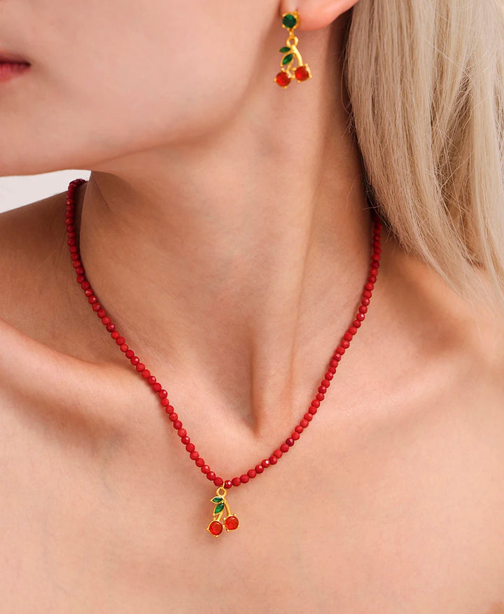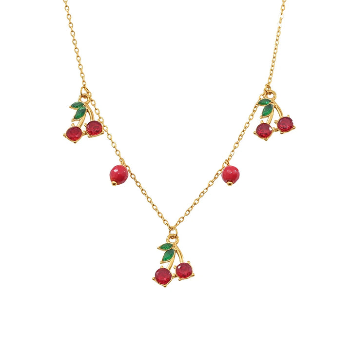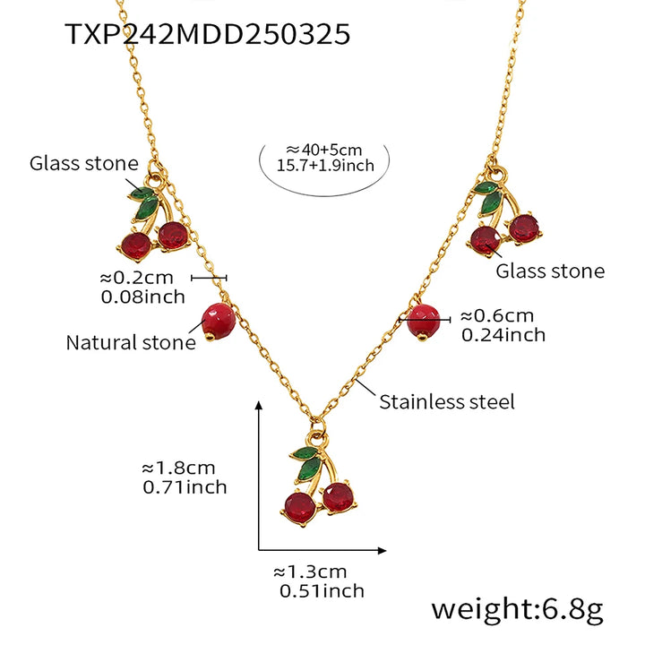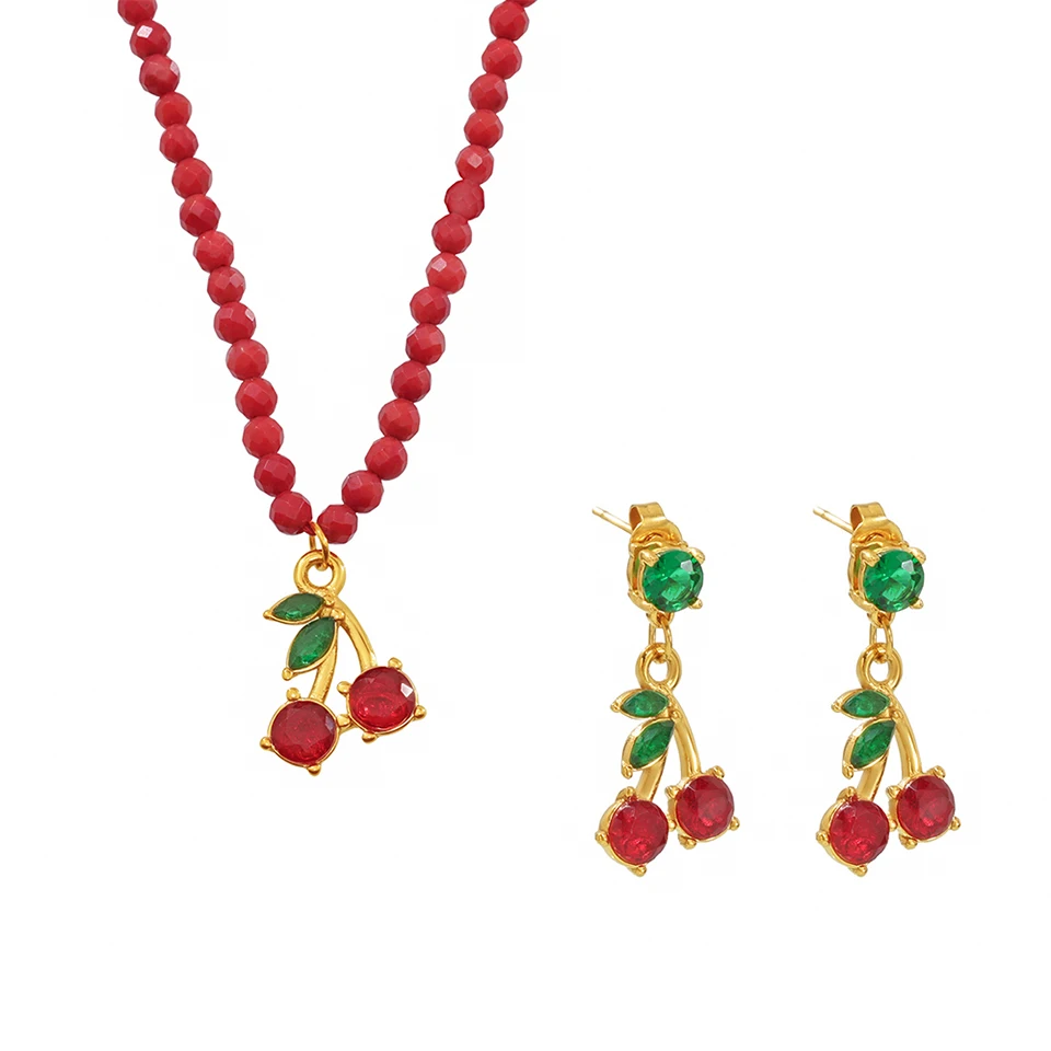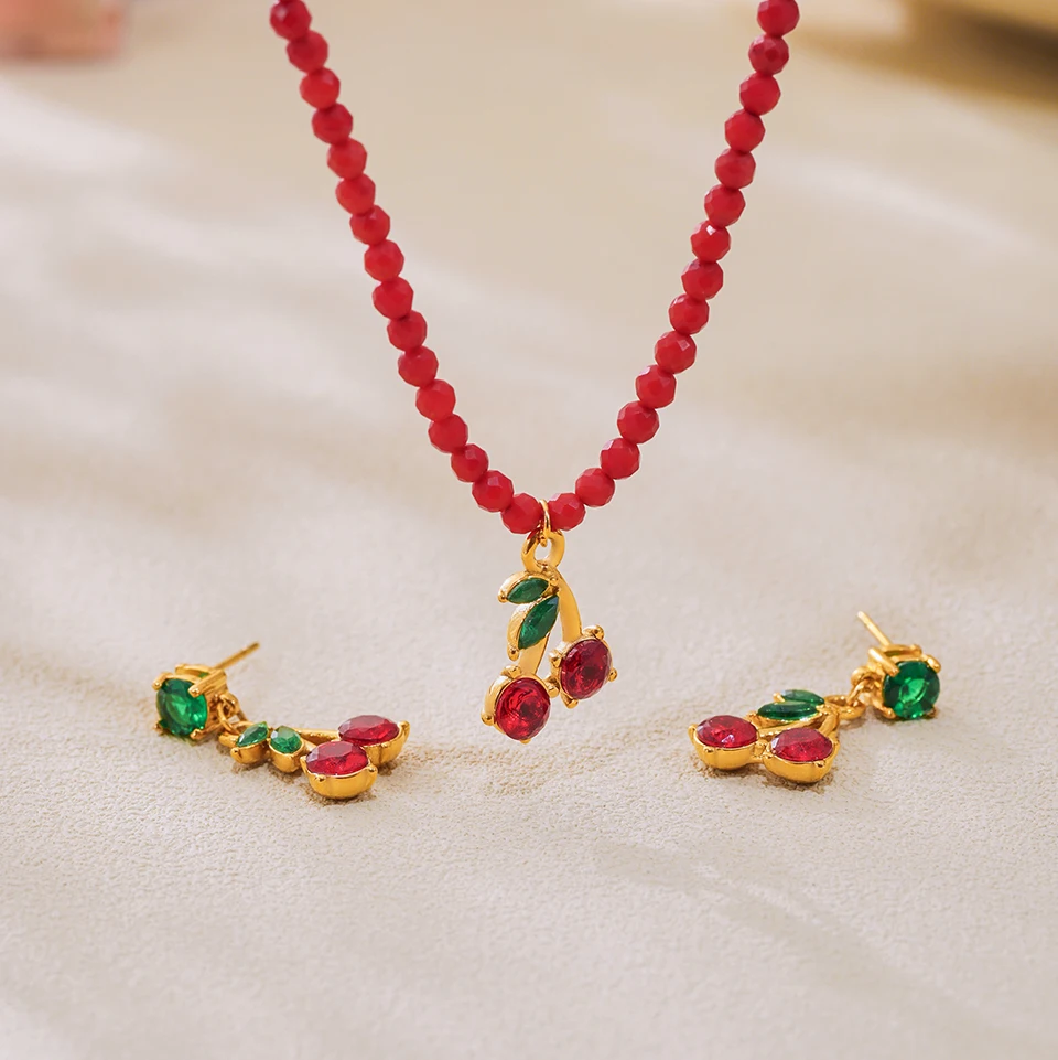 Cherry Charms Necklaces Matching Earrings For Women 18k Gold Plated Stainless Steel Women's Pendant Chain Necklace Stud Earring