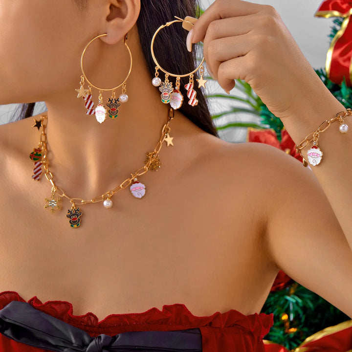 Christmas Cute Gingerbread Cookie Pendant Bracelet Necklace for Women Cartoon Snowman Santa Elk Earrings Festival Jewelry Set