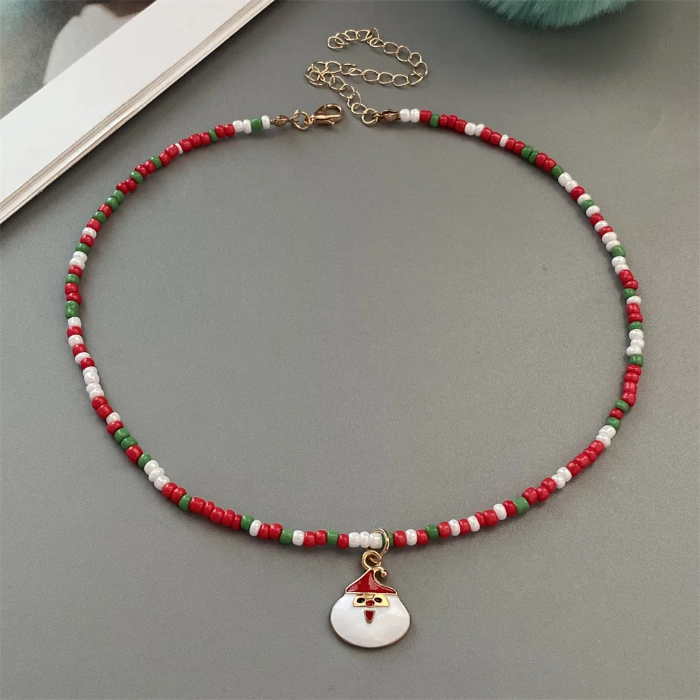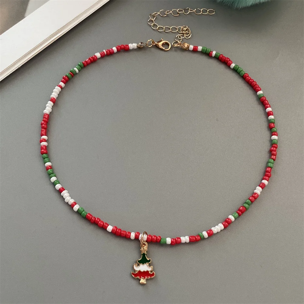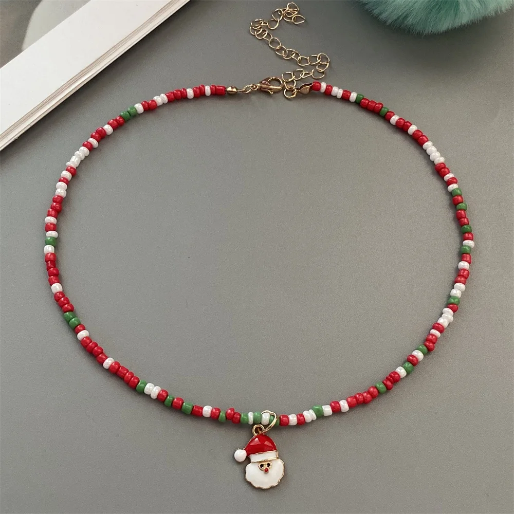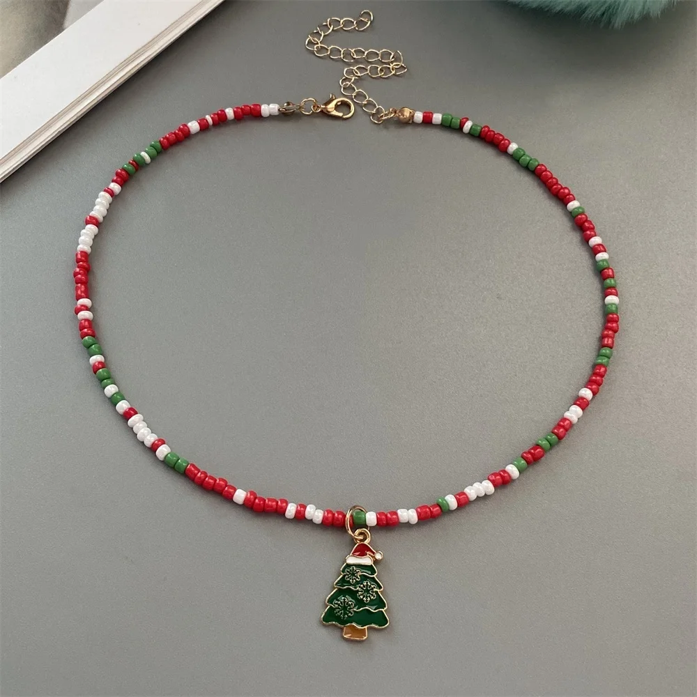Christmas Necklaces for Women Girls Handmade Rice Beads X'mas Tree Santa Claus Snowman Gift Necklace Pendant New Year Jewelry