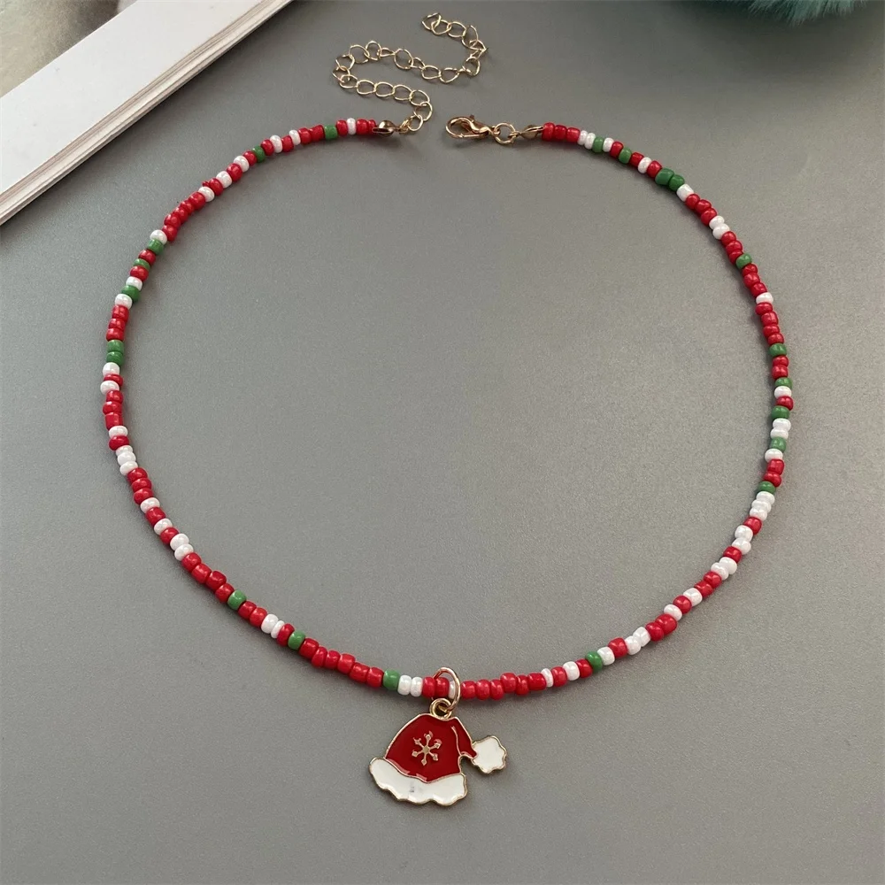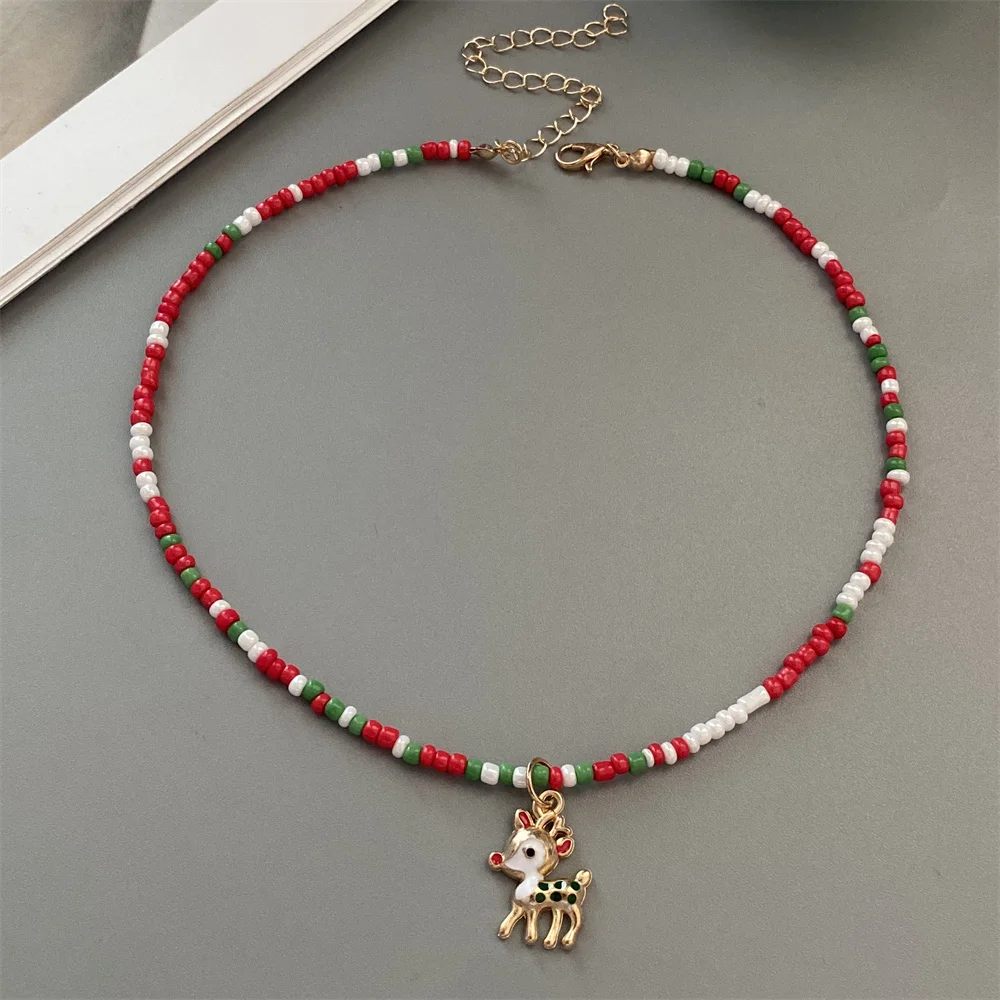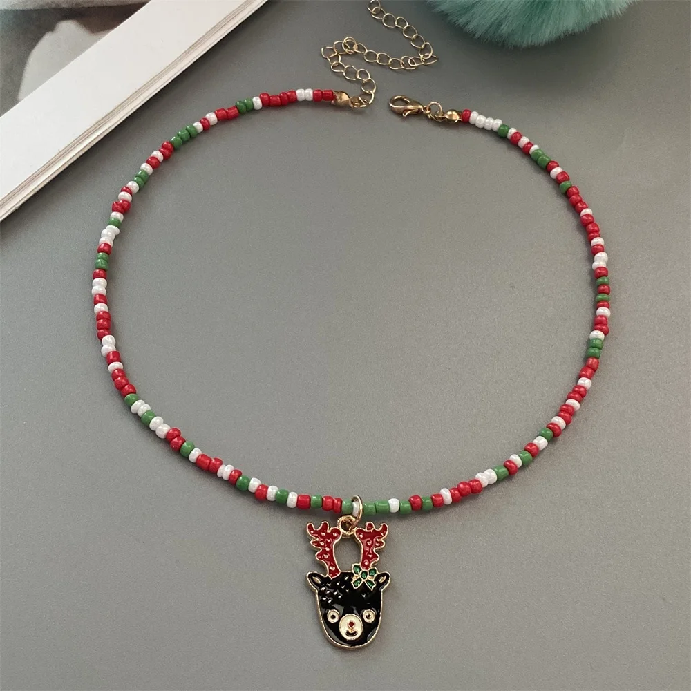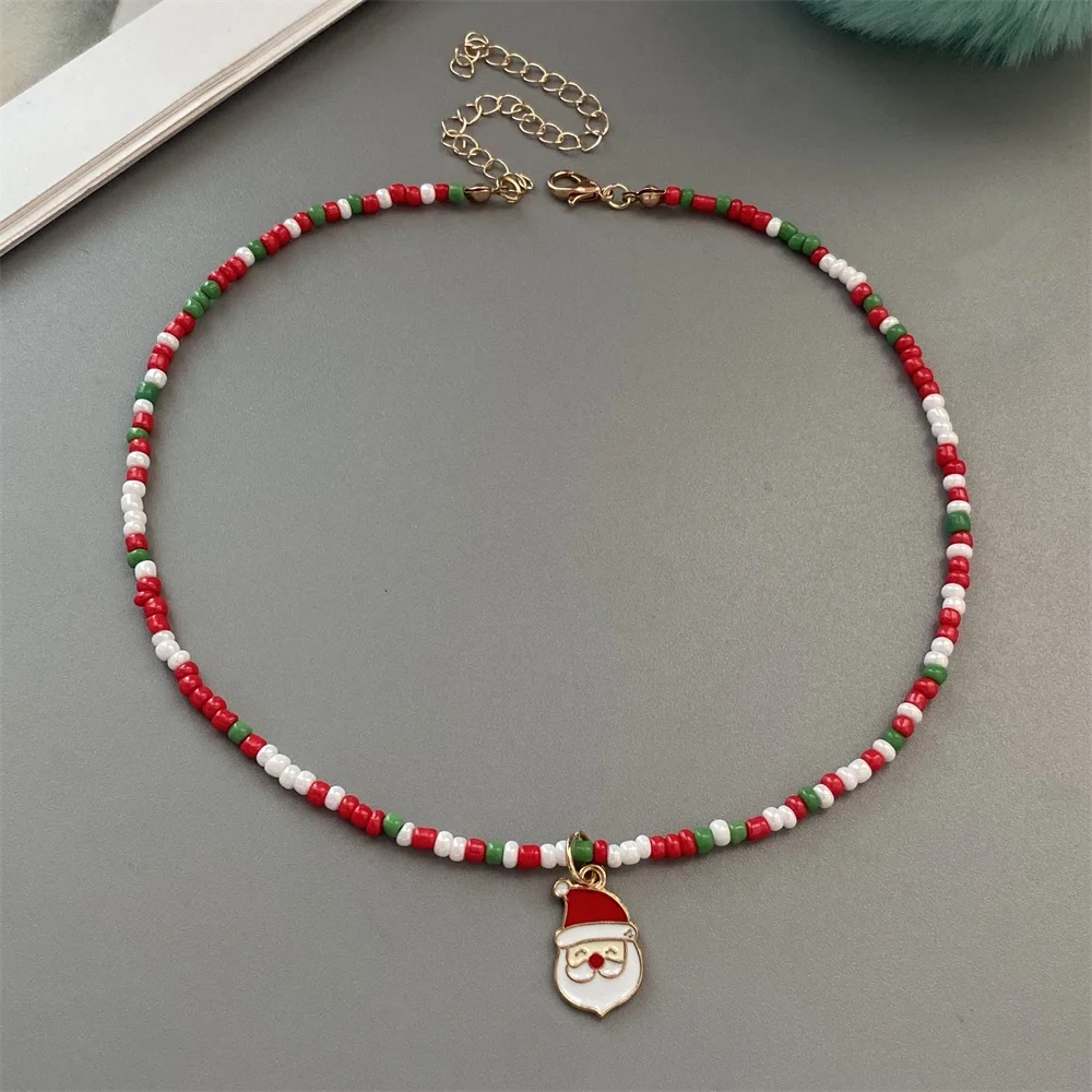 Christmas Necklaces for Women Girls Handmade Rice Beads X'mas Tree Santa Claus Snowman Gift Necklace Pendant New Year Jewelry