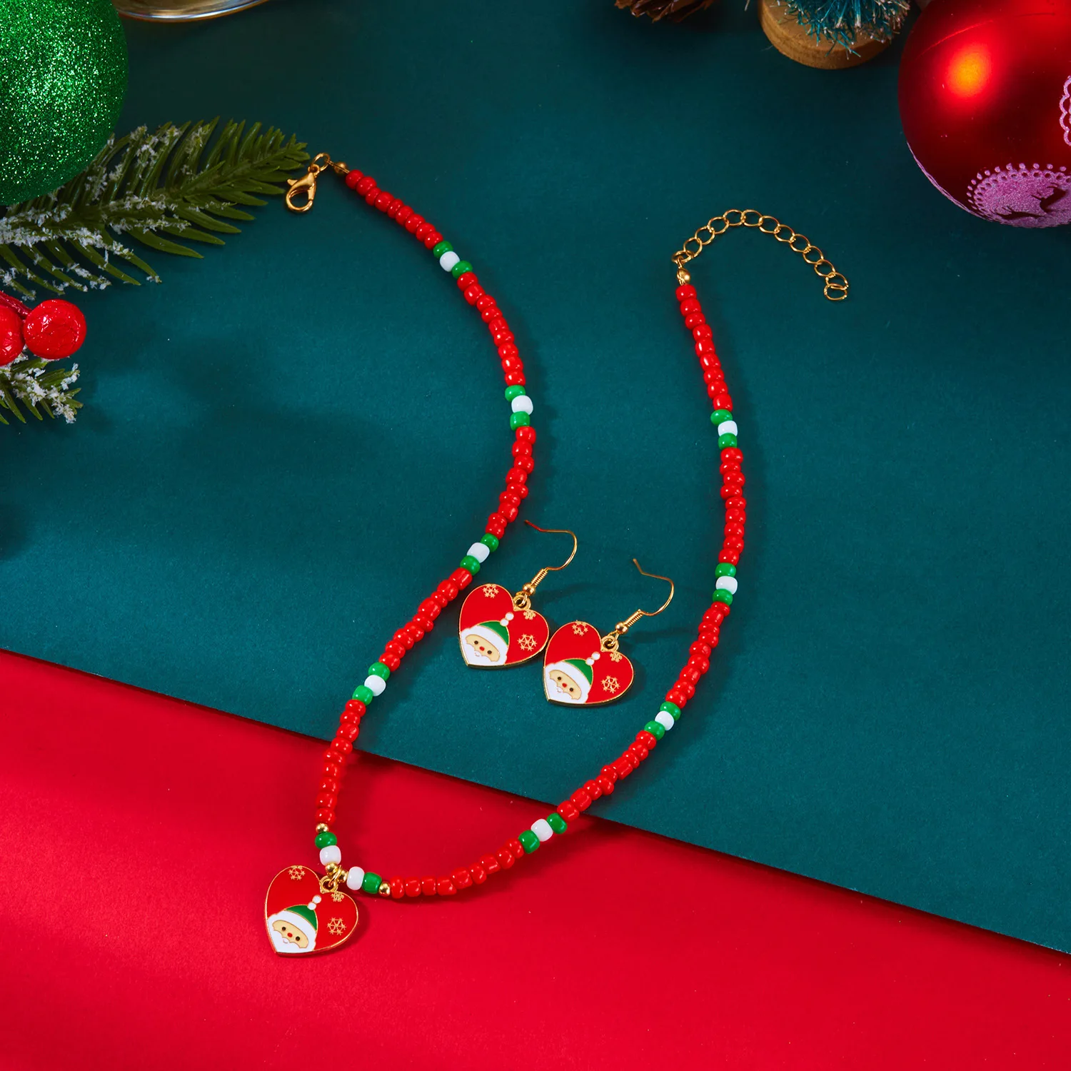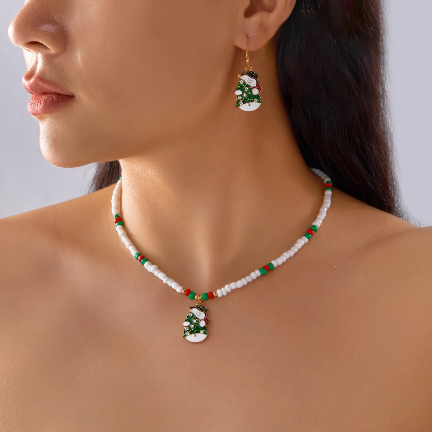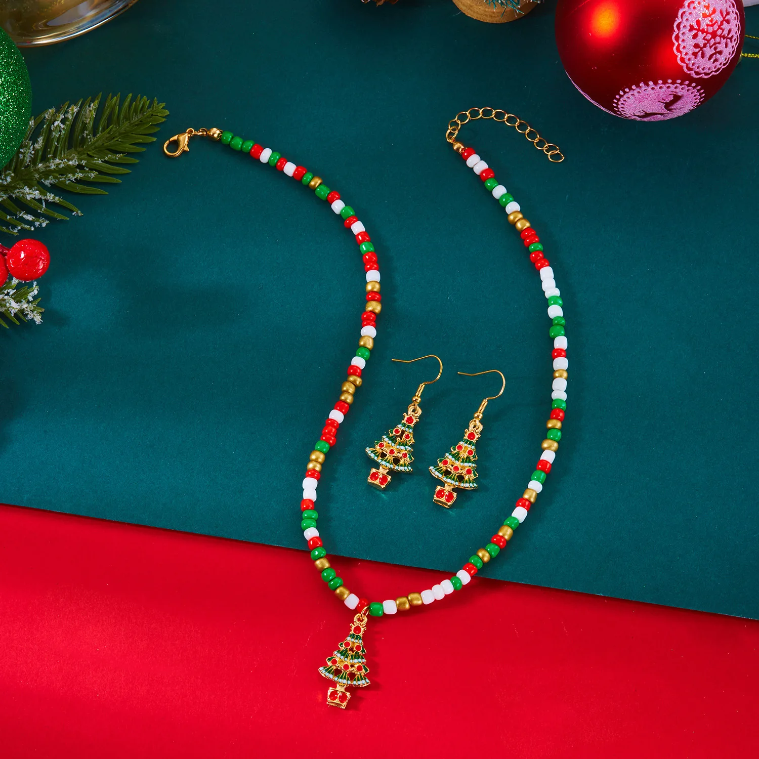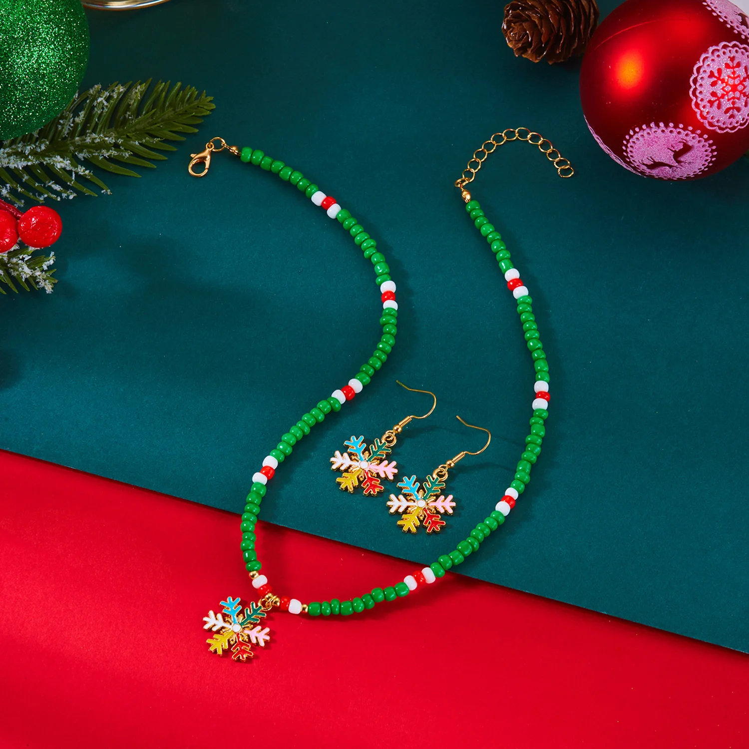 Fashion 3-piece Christmas Tree Snowflake Rice Bead Necklace Earring Set Christmas Gift Suitable for Daily Wearing