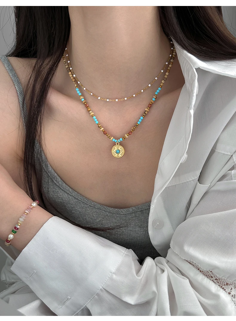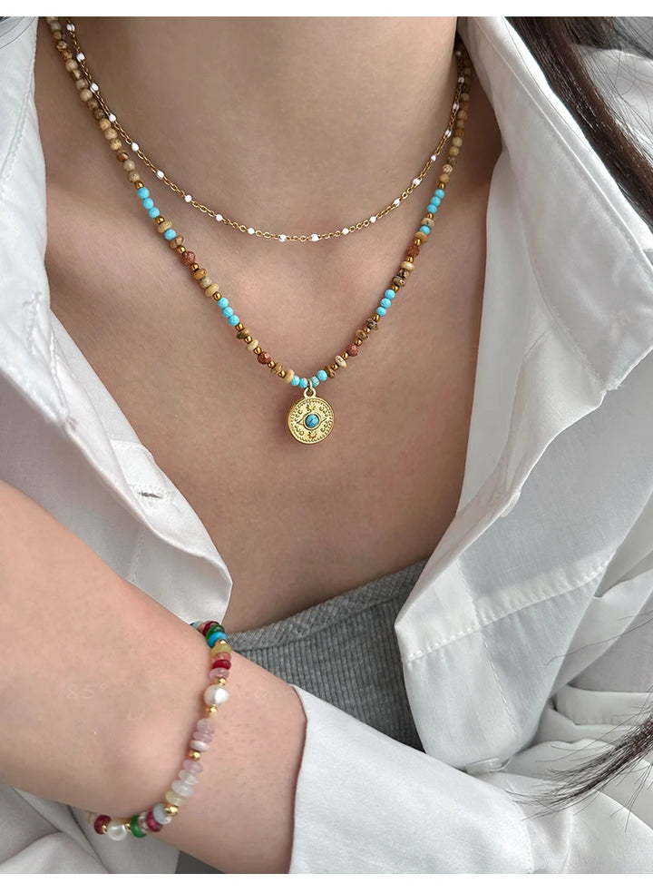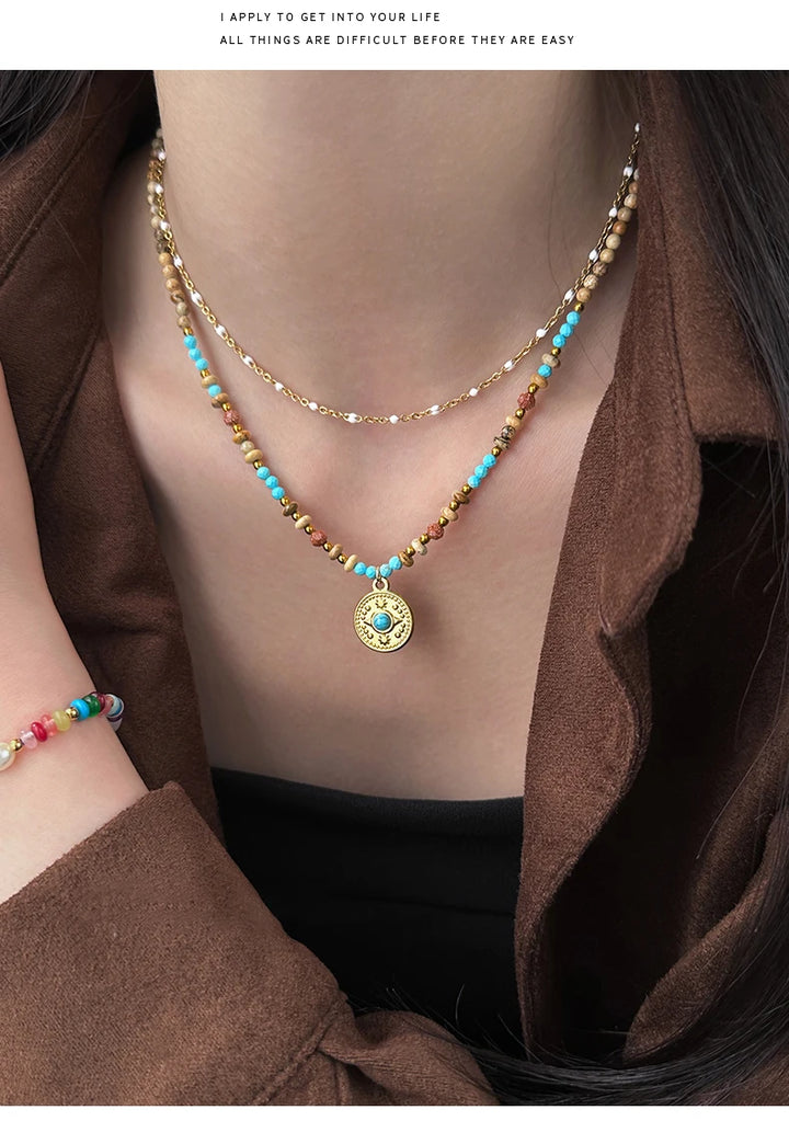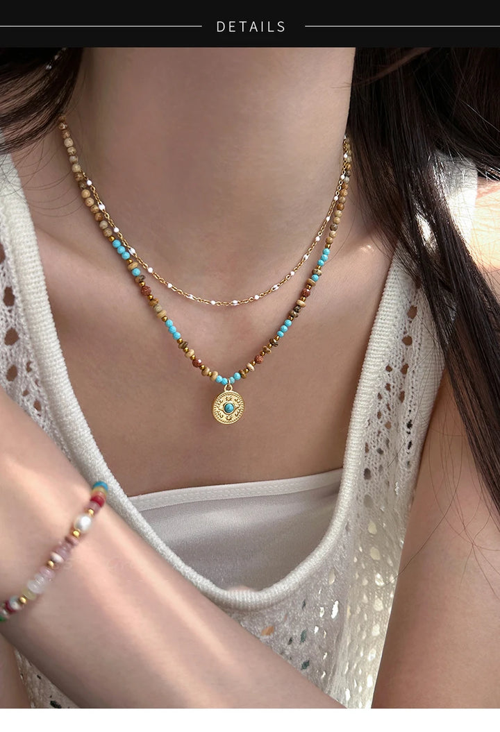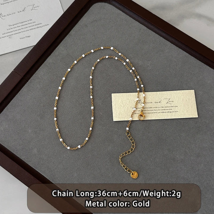 Gold Color Stainless steel Chain Bead Round Pendant Double-layer Necklace For Women Trendy Jewelry Christmas Fashion Accessories