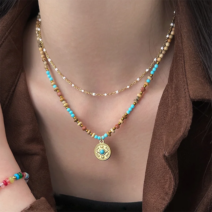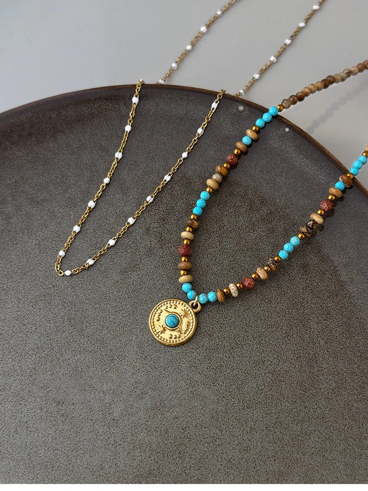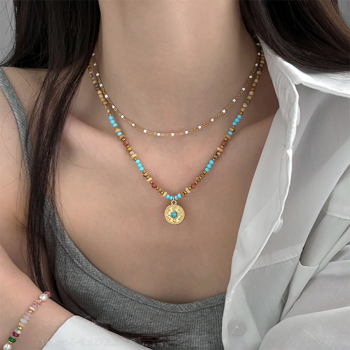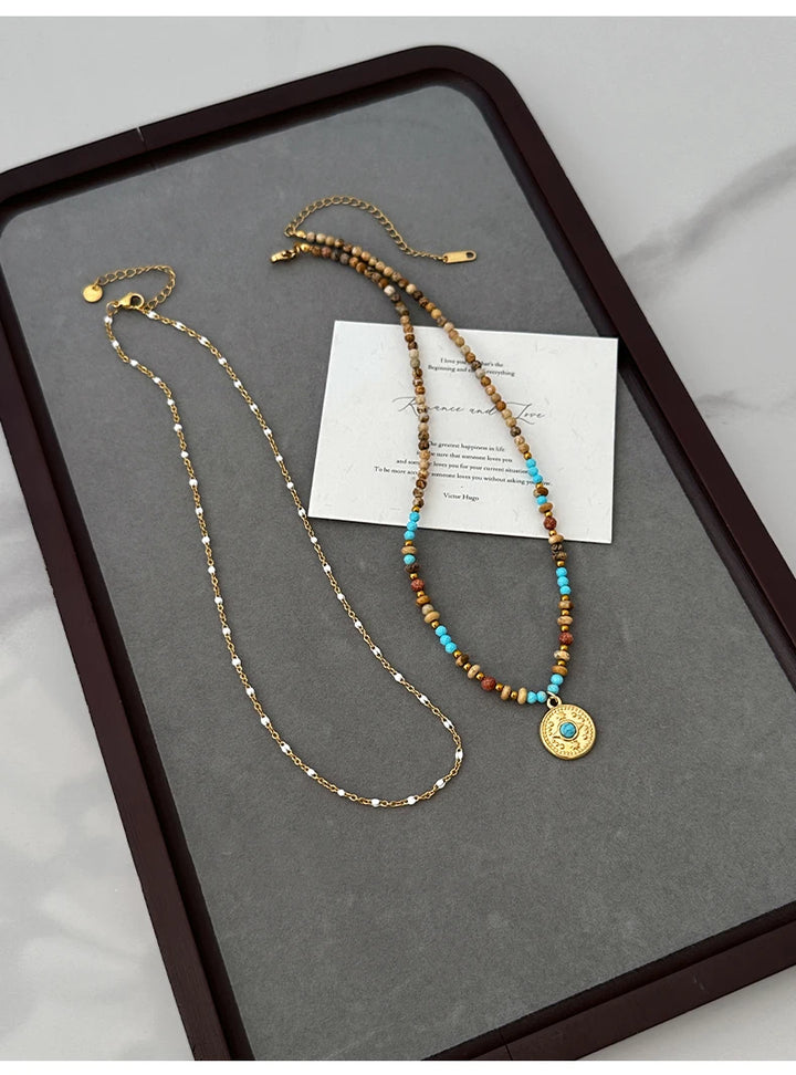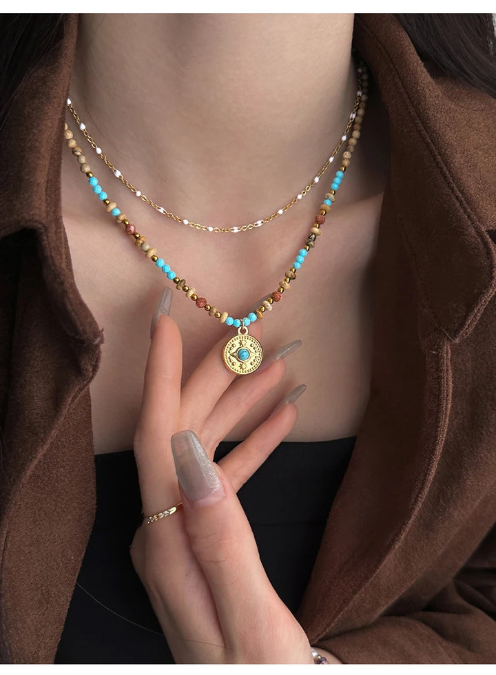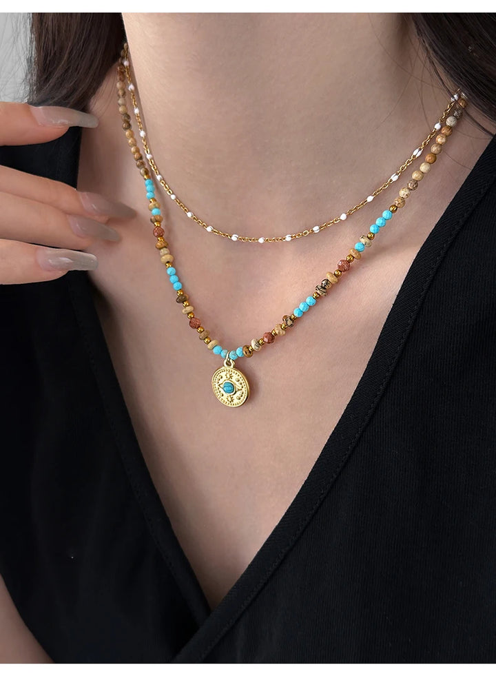 Gold Color Stainless steel Chain Bead Round Pendant Double-layer Necklace For Women Trendy Jewelry Christmas Fashion Accessories