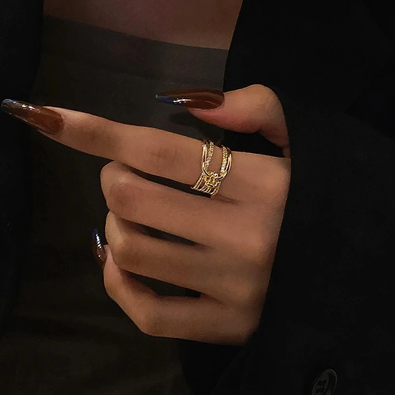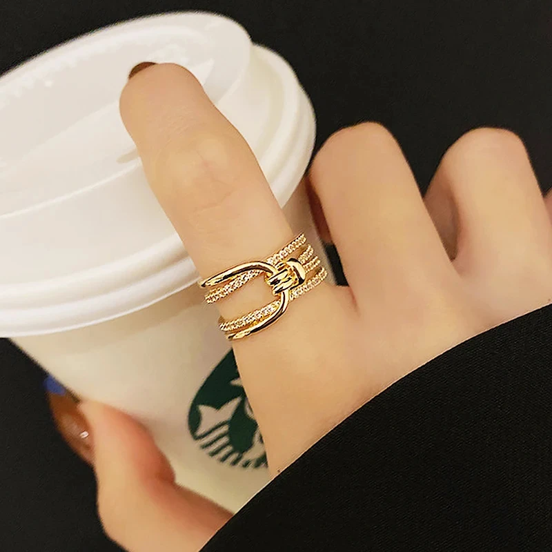 Irregular Hollow Opening Rings For Women Shiny Zircon Gold Color Copper Geometric Ring Fashion Simple Party Jewelry Gift