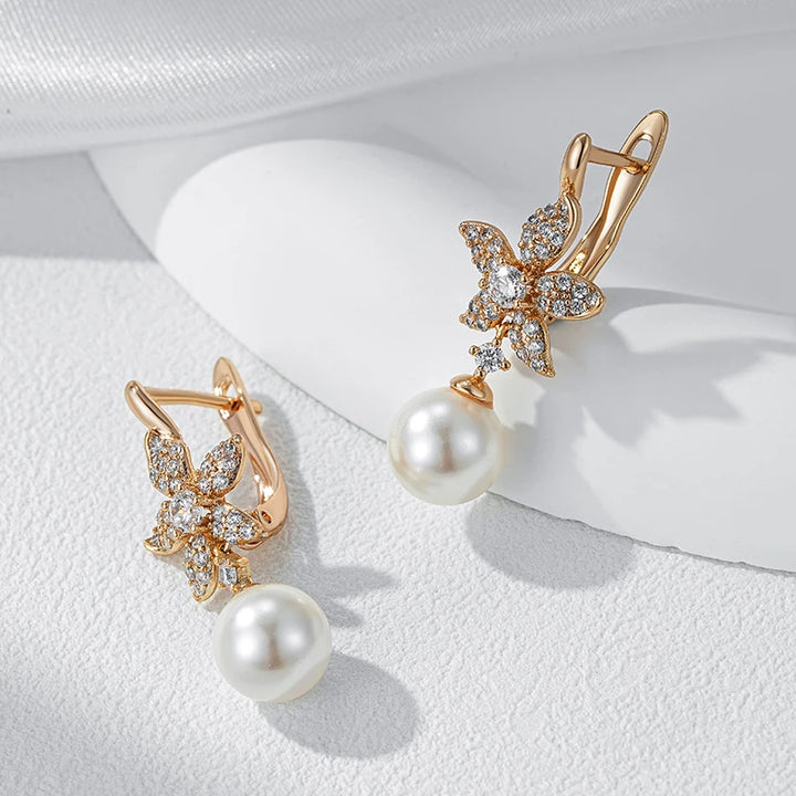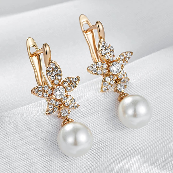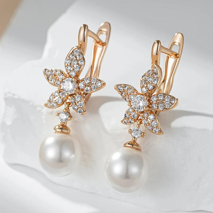 Kinel Luxury Crystal Flower Pearl Long Dangle Earrings Trendy 585 Rose Gold Color With Natural Zircon Daily Fine Women Jewelry