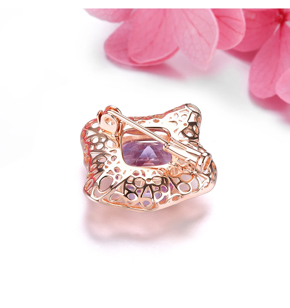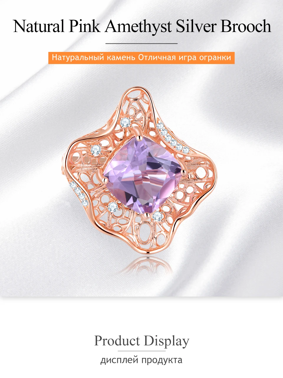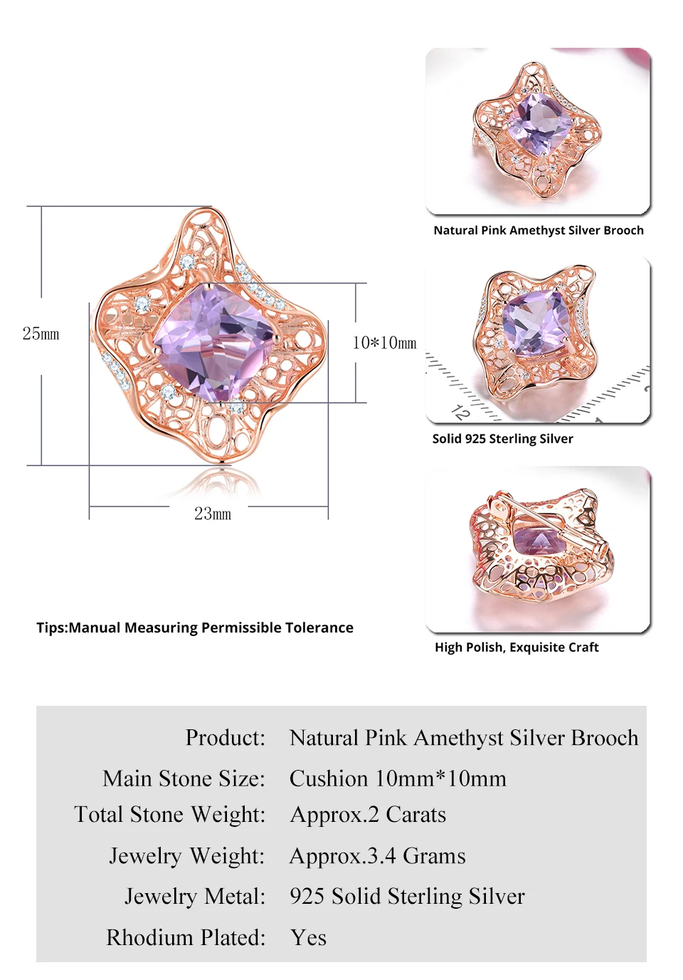 Natural Pink Amethyst Sterling Silver Brooch Rose Gold Plated 2 Carats Genuine Gemstone Unique Original Design Romantic Style