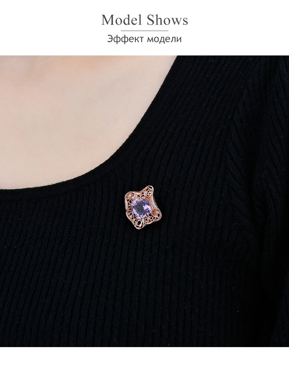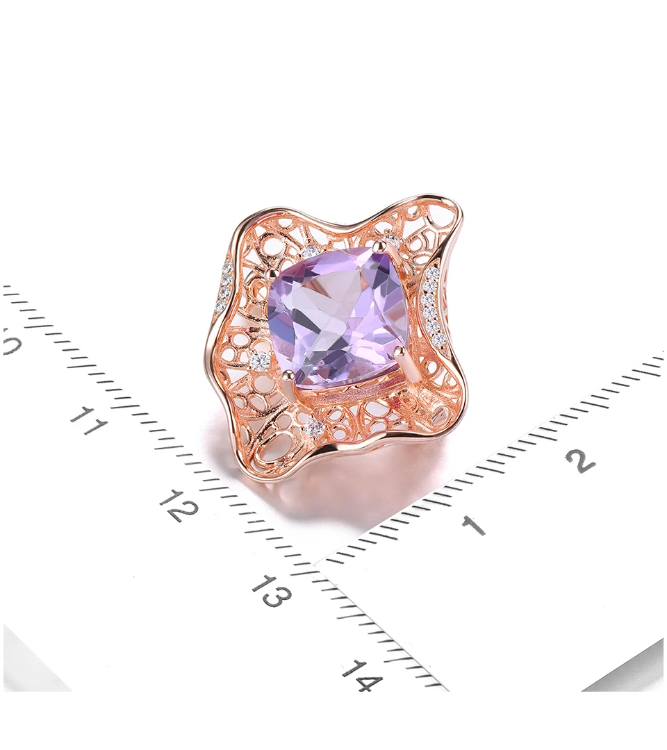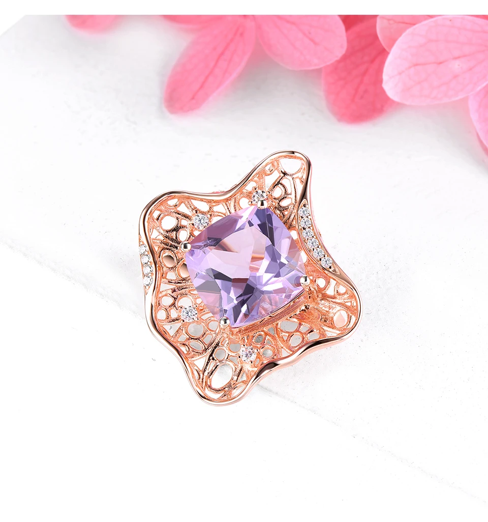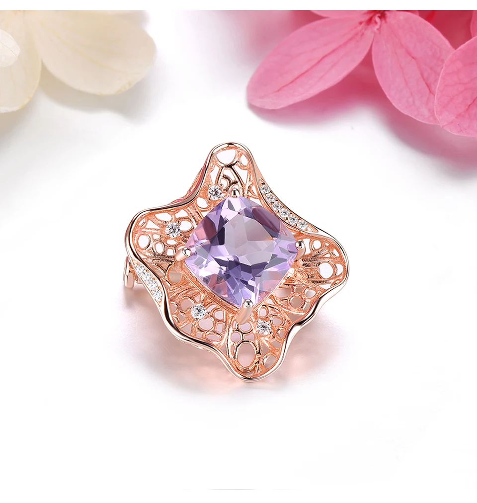 Natural Pink Amethyst Sterling Silver Brooch Rose Gold Plated 2 Carats Genuine Gemstone Unique Original Design Romantic Style