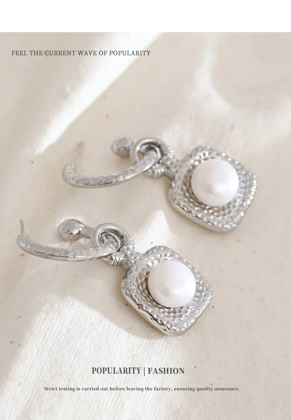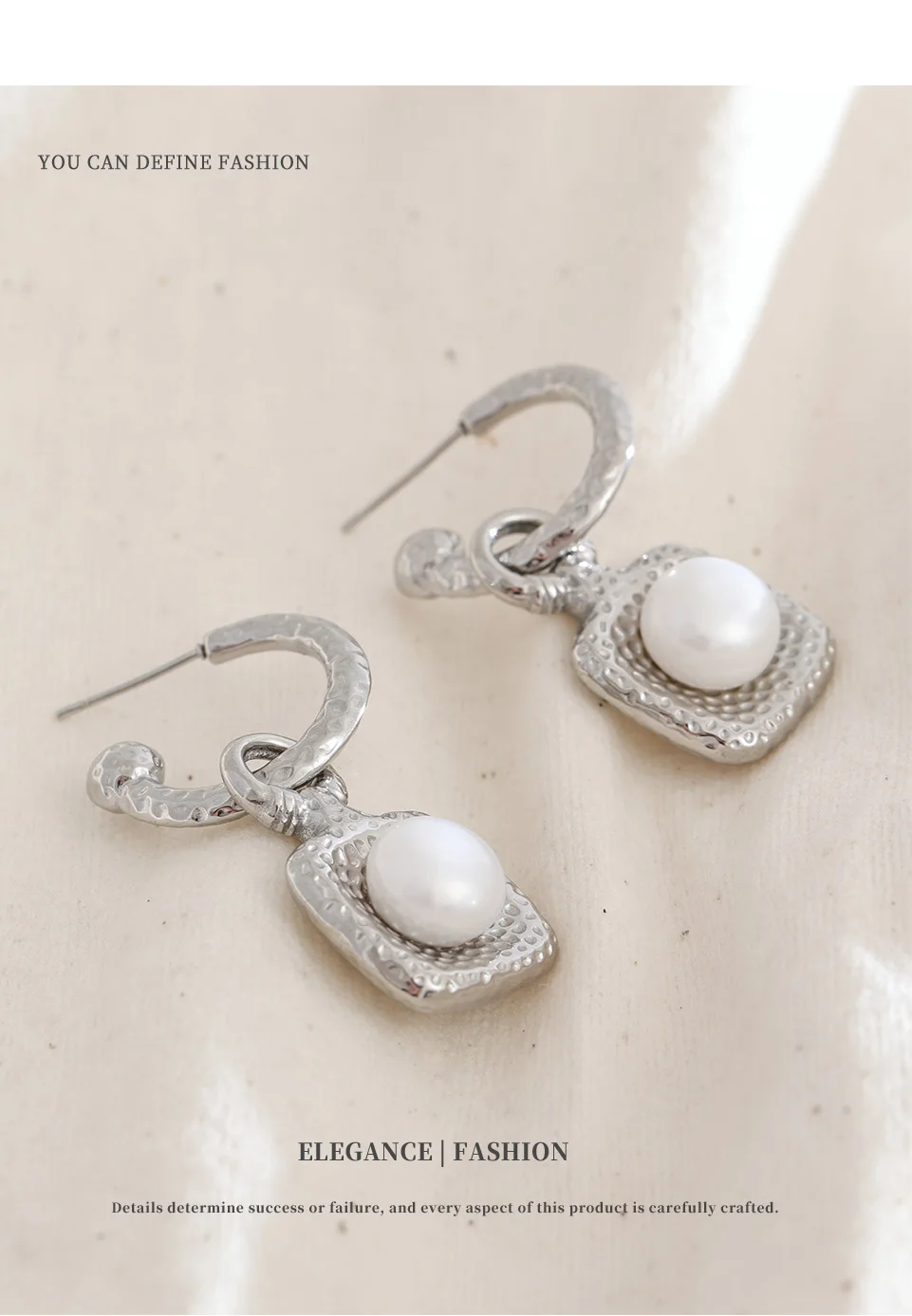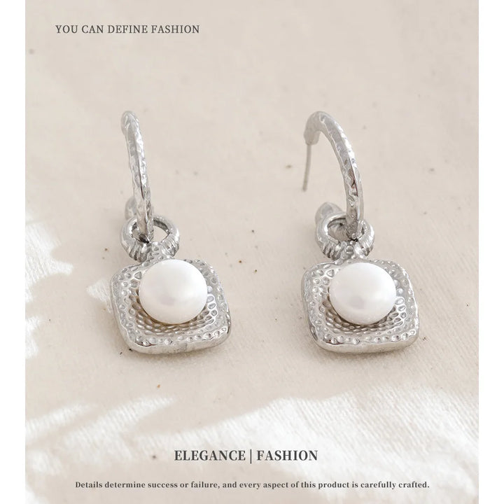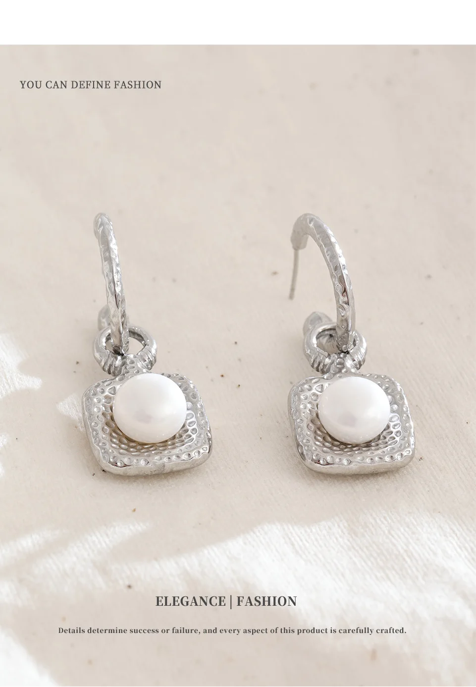 Stainless Steel Earrings Square Freshwater Pearl Pendant with Retro Fashionable Design Personalized Jewelry Gift