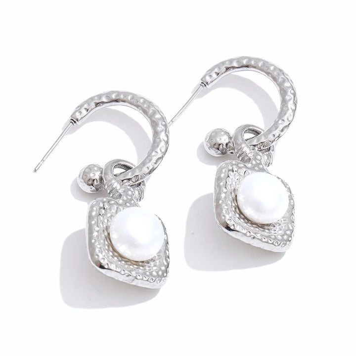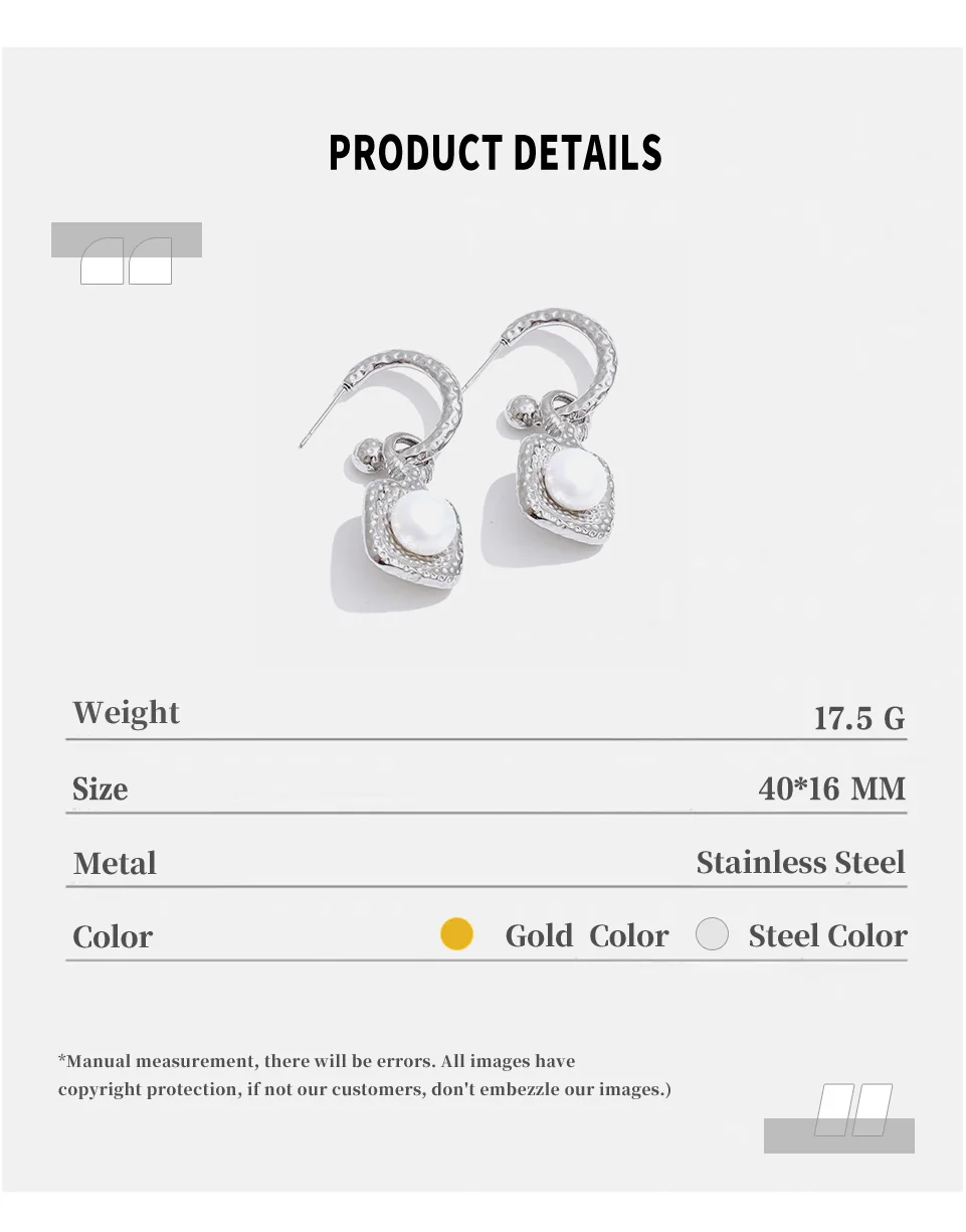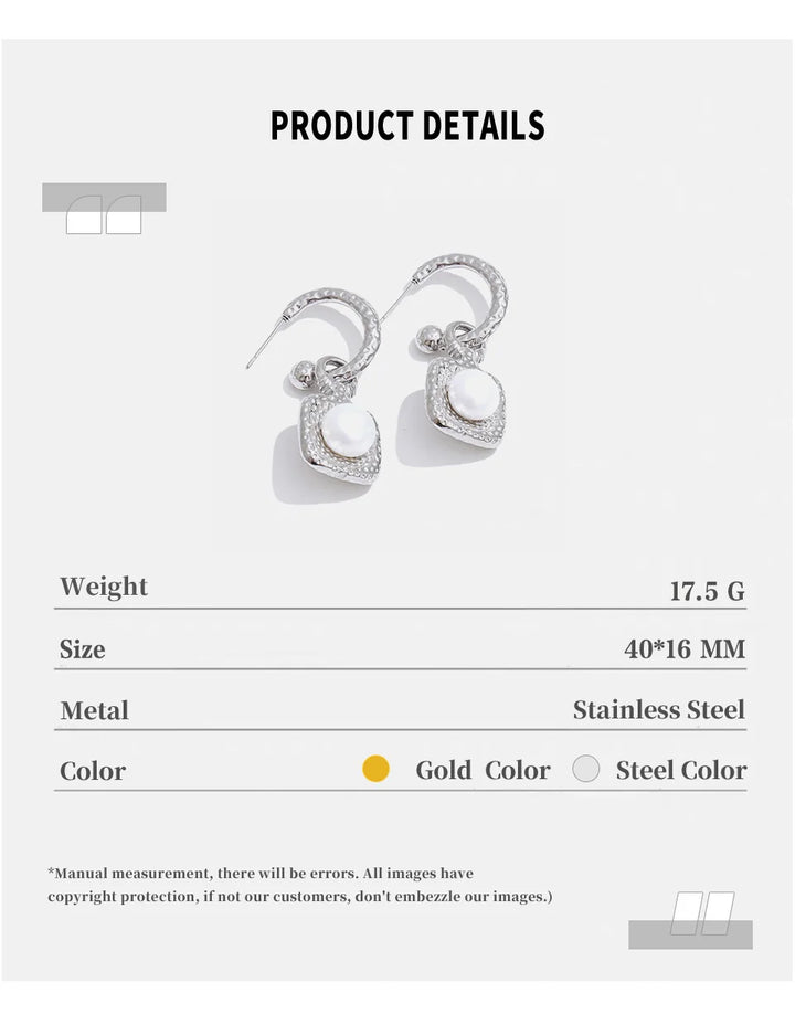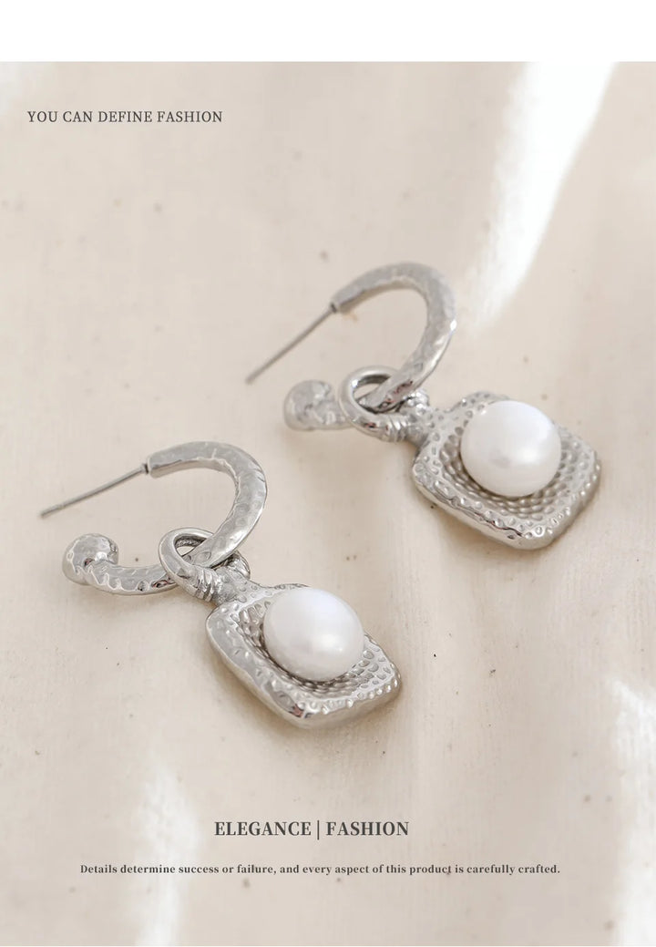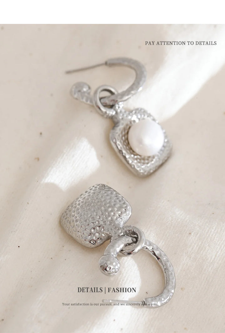 Stainless Steel Earrings Square Freshwater Pearl Pendant with Retro Fashionable Design Personalized Jewelry Gift