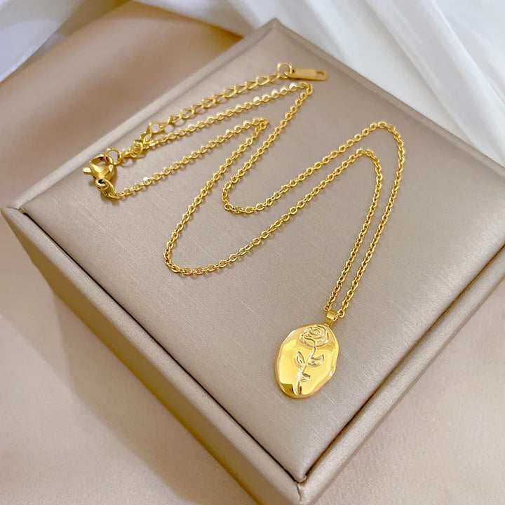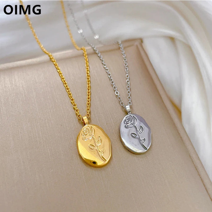 OIMG 316L Stainless Steel Gold Color Itregular Geometric Rose Flower Pendant Necklace For Women Gir Birthday Gifts