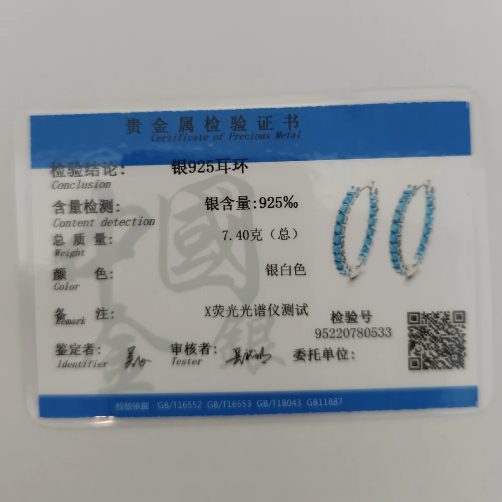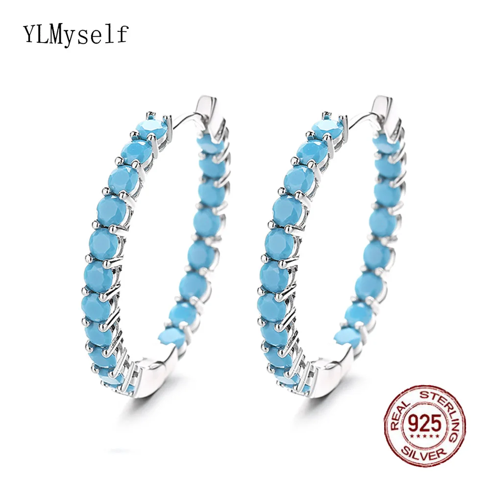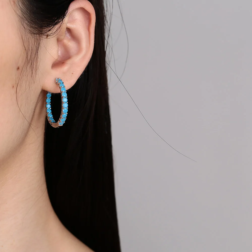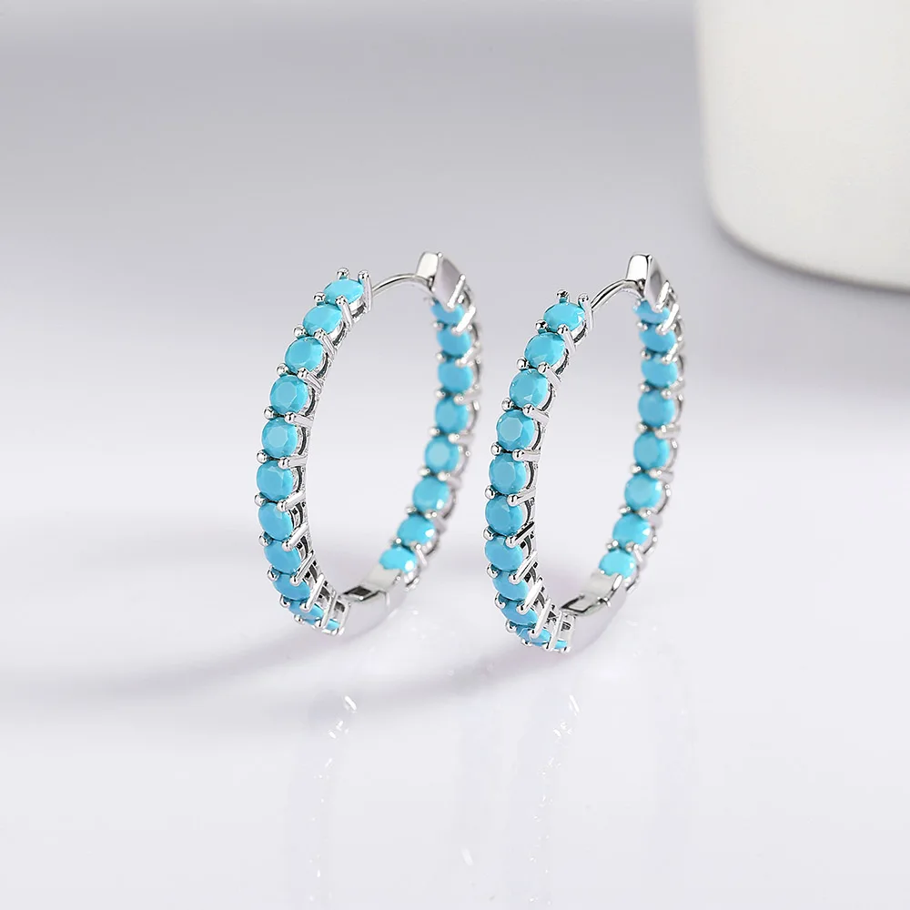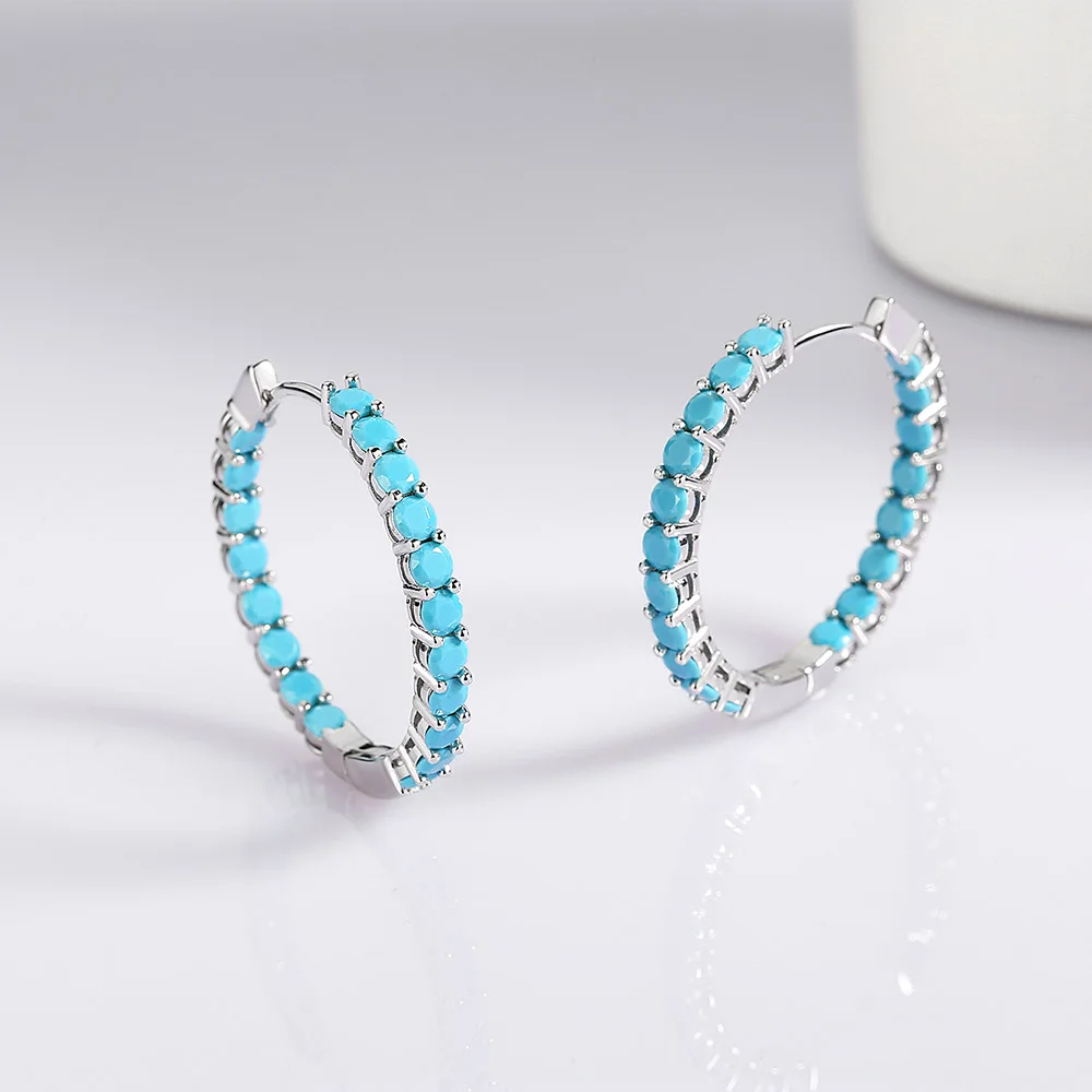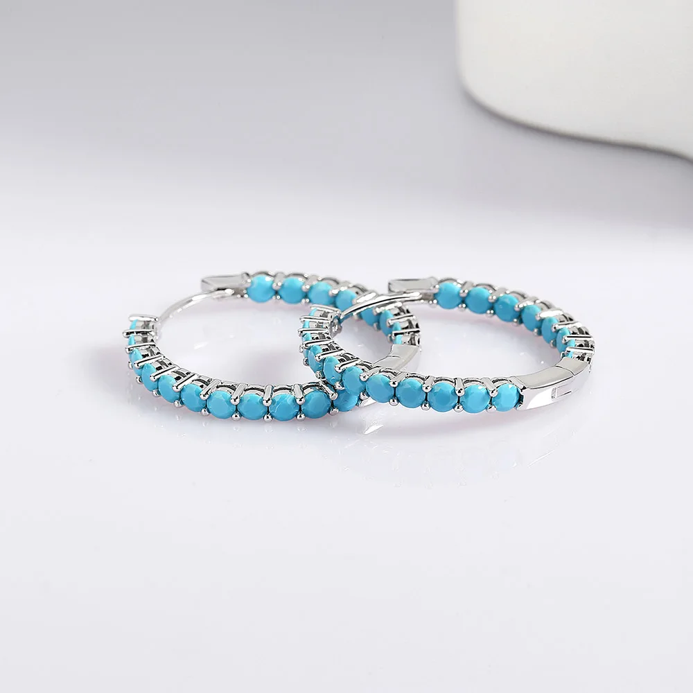 Solid Silver 30MM Hoop Earring Pave 3mm Turquoise Natural Stone 925 Sterling Silver Circle Round Earrings Fine Jewelry
