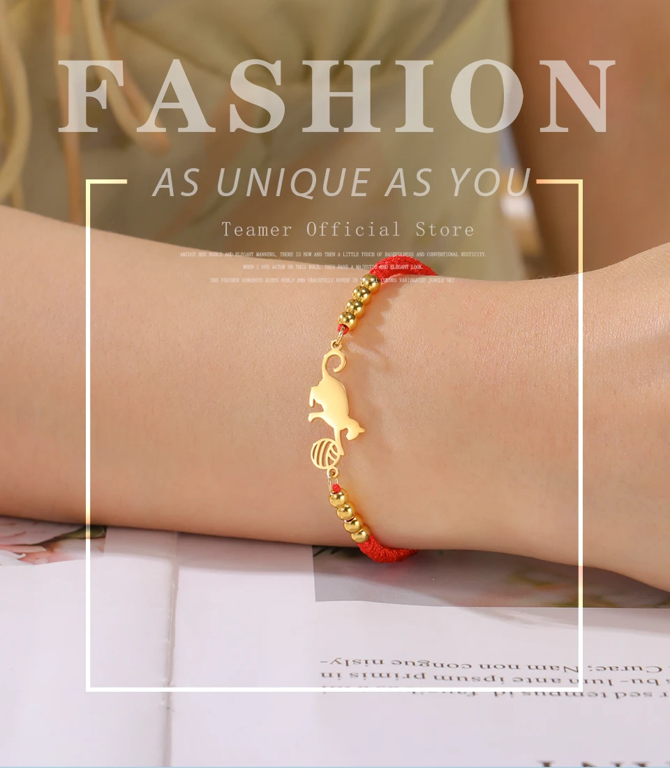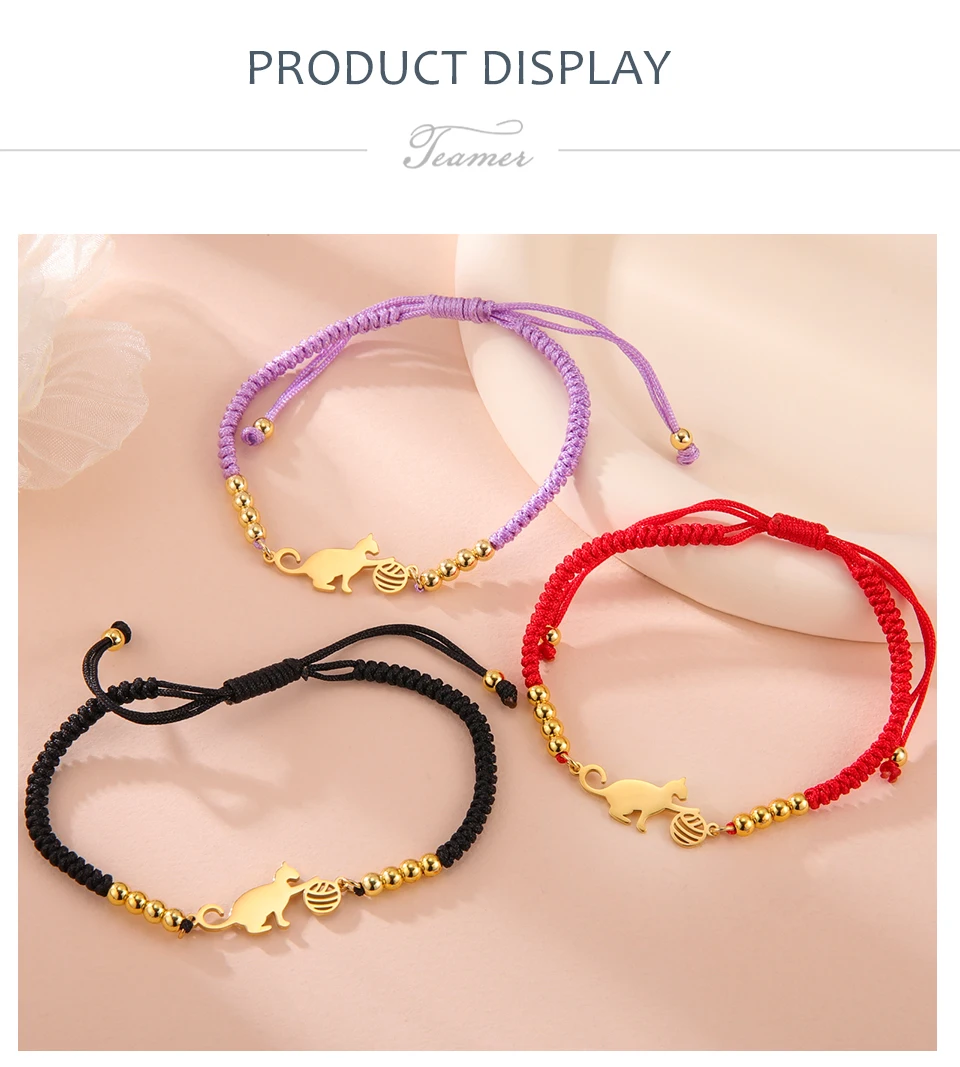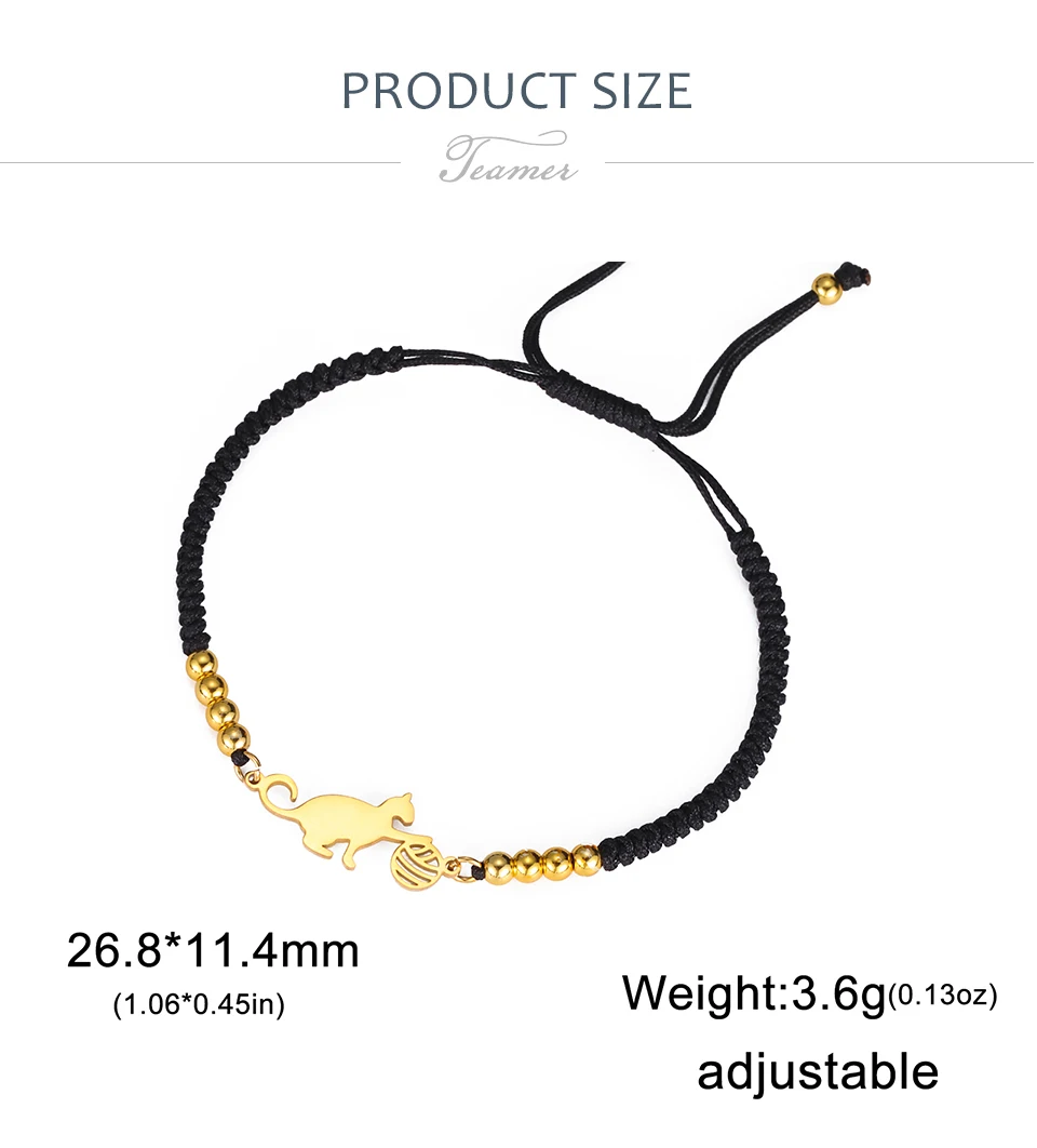 Teamer Cat &Ball Stainless Steel Charm Bracelet For Women Girls Gold Color Bead Adjustable Rope Chain Cute Jewelry 2025 New