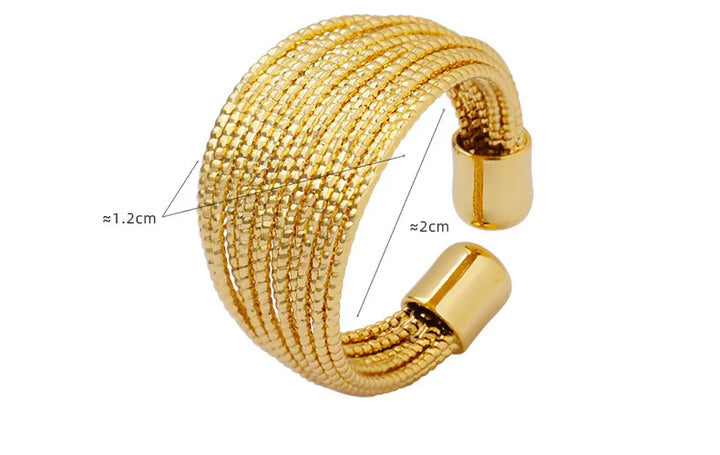 Women’s ring with a stylish design, featuring multilayered curved lines and a semi-circular copper material.