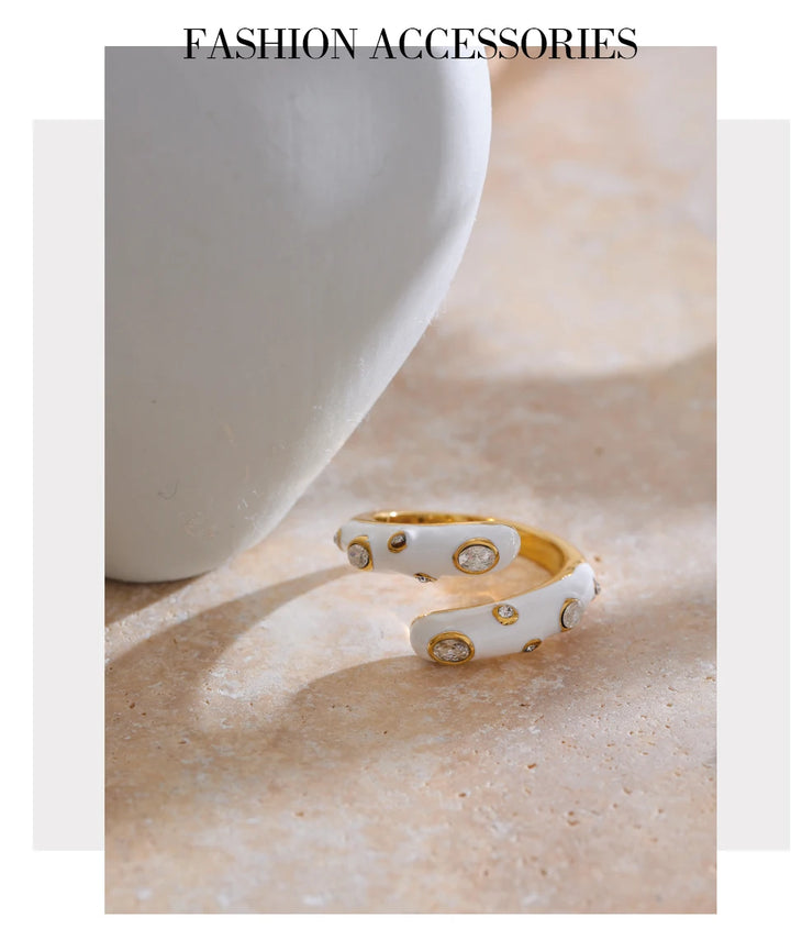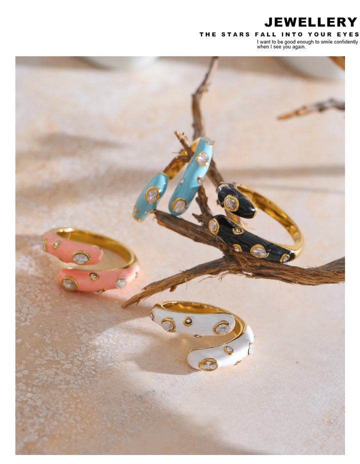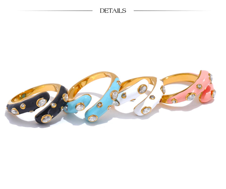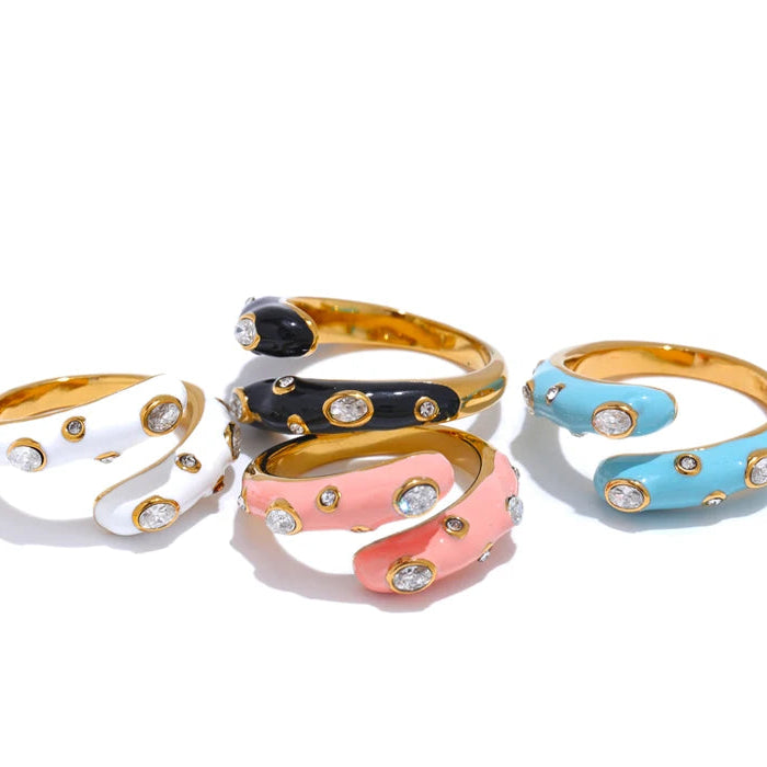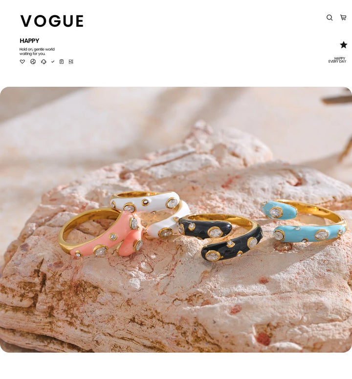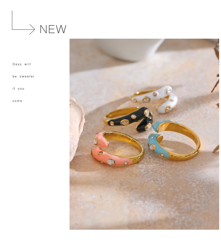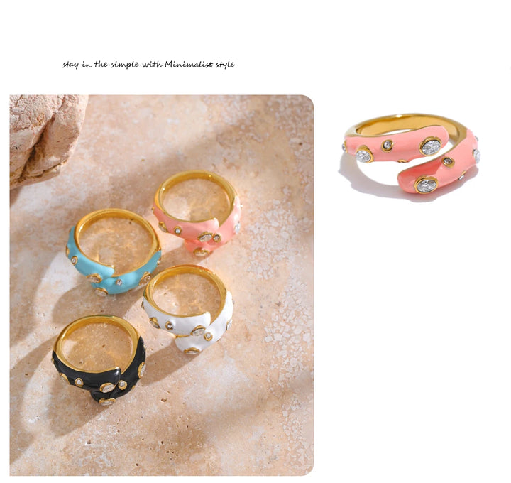 Yhpup Adjustable Candy Y2K Blue White Black Pink Enamel Cubic Zirconia Exquisite Open Ring Golden Stainless Steel Jewelry Gift
